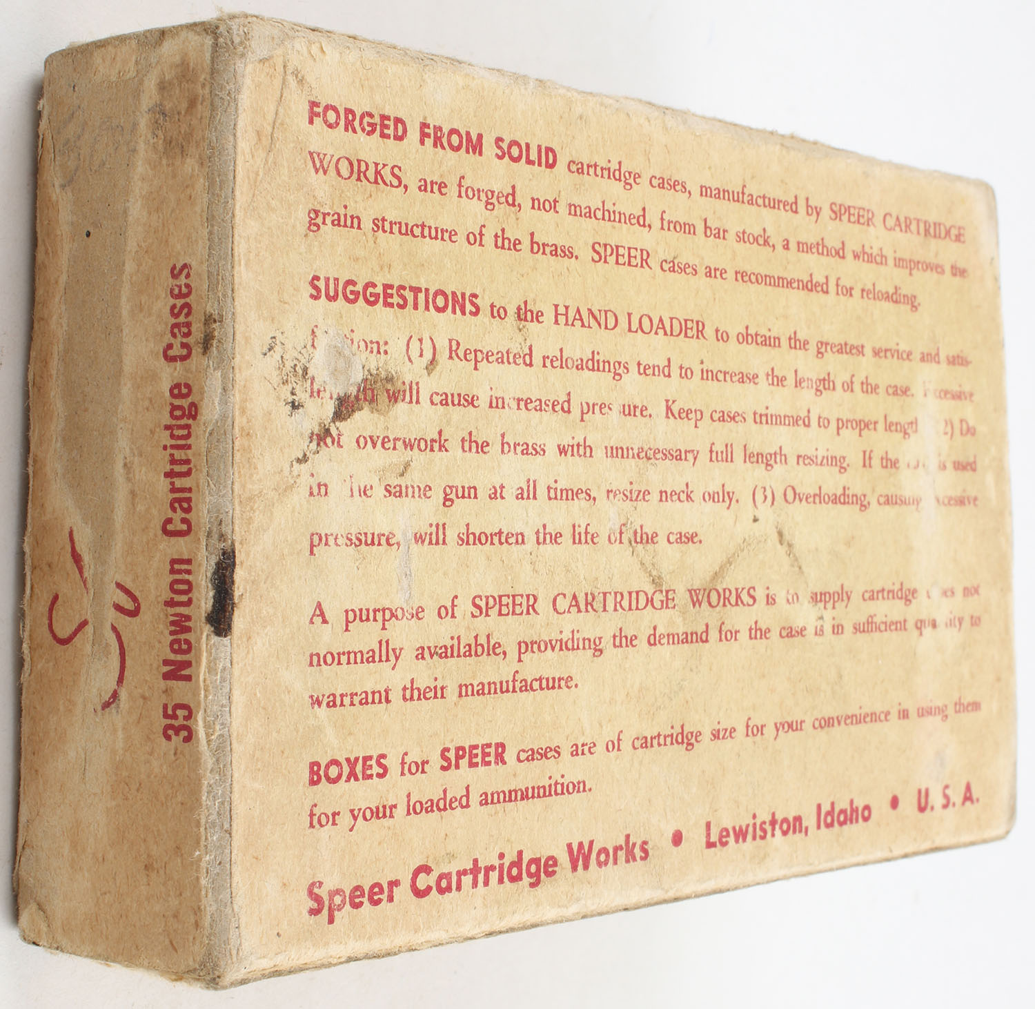Speer, Center Fire Cartridges, .35 Newton, Full of Brass Only, 1pc. Buff box with red print, box has scuffing, edge & corner wear, end flaps are solid, brass is excellent. Grade: Very Good - Value: 20 to 60