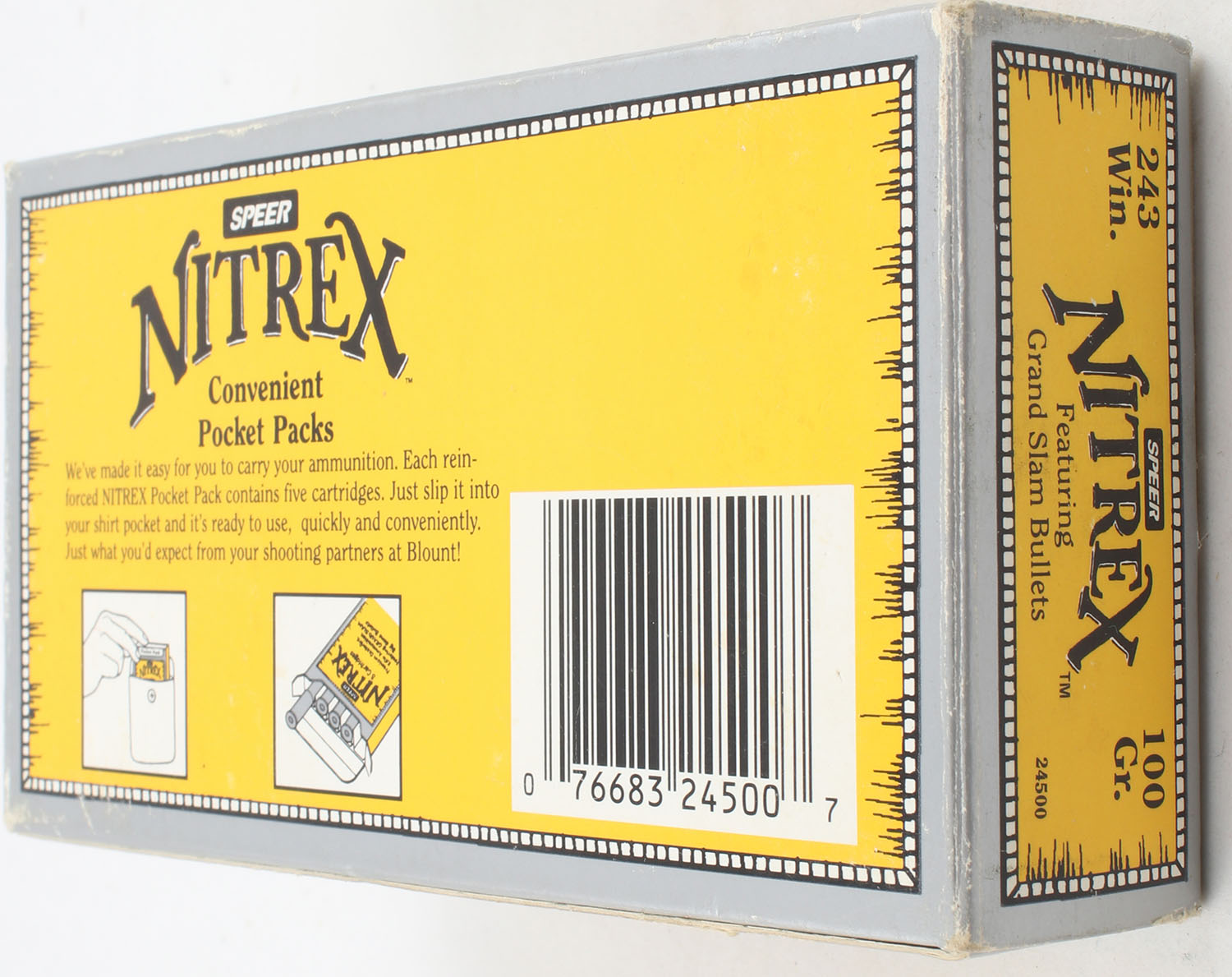 Speer, Nitrex, .243 Winchester, 100 Grain Grand Slam, Full, 1pc. Multi-colored box, box is very solid with excellent color, ammo is minty. Grade: Excellent + - Value: 20 to 60