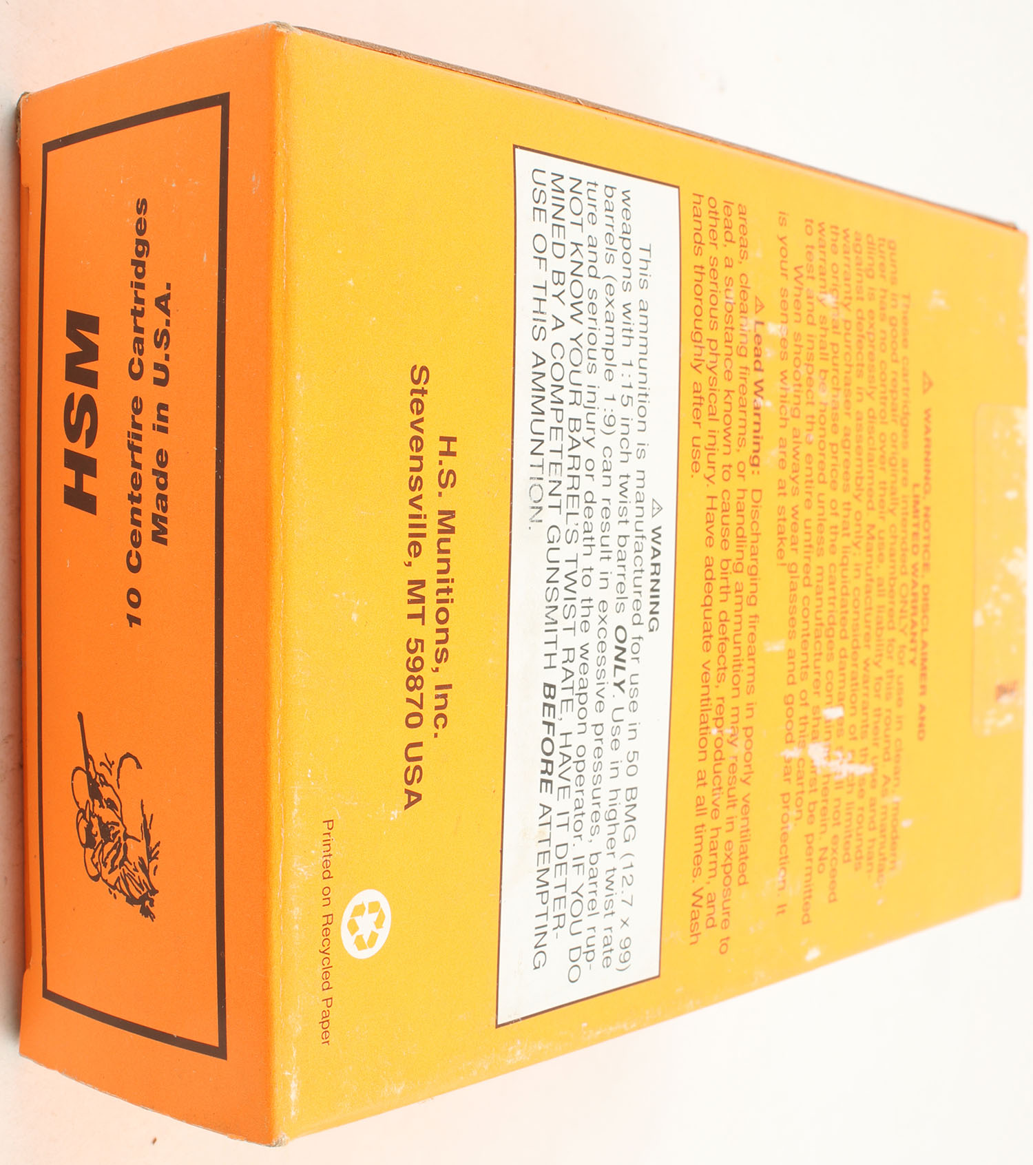 HSM, 50 BMG, 690 Grain AP, Full, 1pc., Orange and black box, box is very solid with excellent color, ammo is excellent. Grade: Excellent ++ - Value: 50 to 75