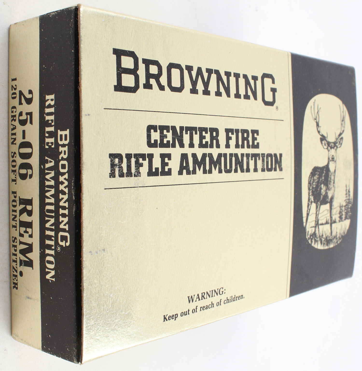 Browning, .25-06 Remington, 120 Grain Soft Point Spitzer, Full, 1pc. Multi-colored box, box is solid with excellent color, end flaps are solid, ammo is excellent. Grade: Excellent - Value: 20 to 40