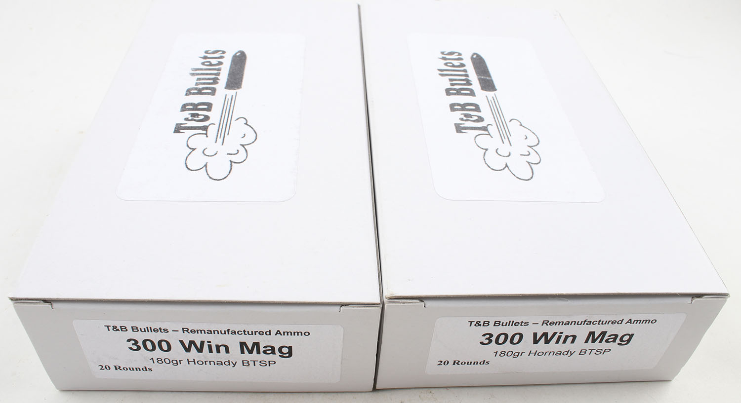 T&B Bullets, Lot of (2), .300 Win. Mag ammo boxes, Remanufactured Ammo by a class type 7 Ammo MFG (this is the same class (high quality) as Winchester, Federal and or CCI), 180 Grain Hornady BTSB bullet, loaded cartridges, Full, 1pc, white box is very solid, ammo is minty. Grade: Excellent ++ - Value: 20 to 80