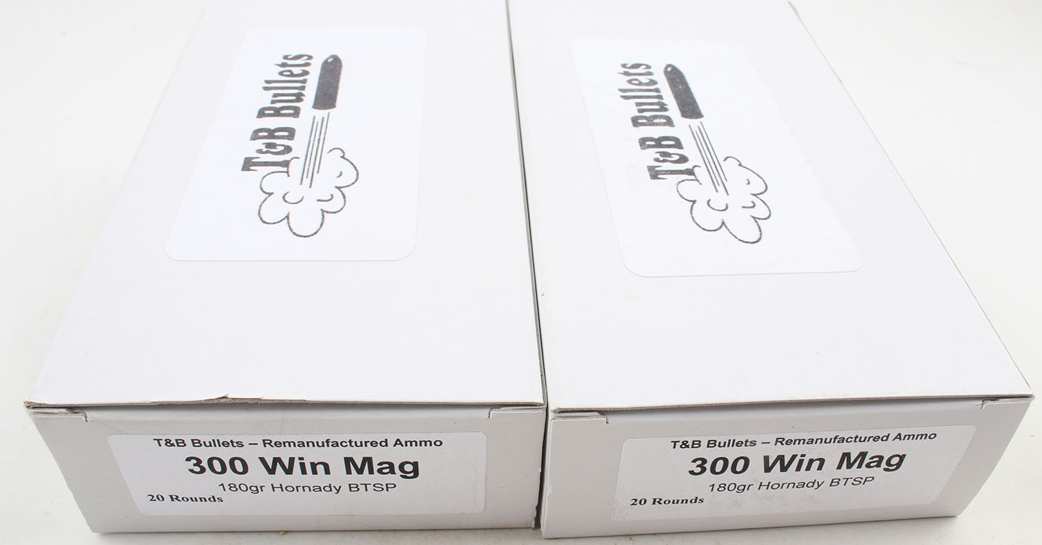 T&B Bullets, Lot of (2), .300 Win. Mag ammo boxes, Remanufactured Ammo by a class type 7 Ammo MFG (this is the same class (high quality) as Winchester, Federal and or CCI), 180 Grain Hornady BTSB bullet, loaded cartridges, Full, 1pc, white box is very solid, ammo is minty. Grade: Excellent ++ - Value: 20 to 80