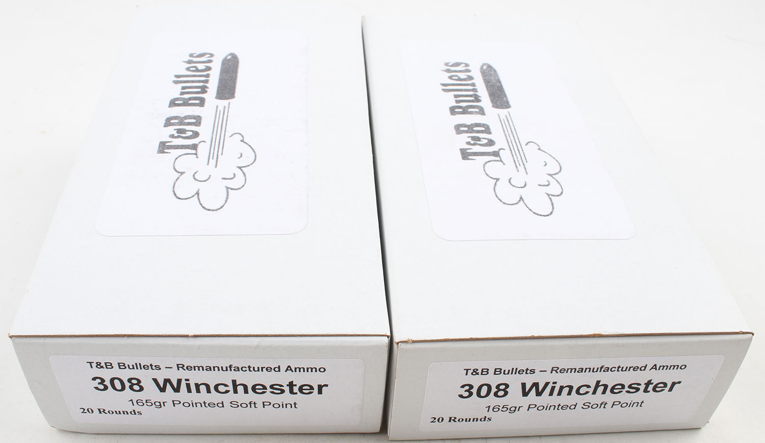 T&B Bullets, Lot of (2), .308 Winchester ammo boxes, Remanufactured Ammo by a class type 7 Ammo MFG (this is the same class (high quality) as Winchester, Federal and or CCI), 165 Grain Soft Point bullet, loaded cartridges, Full, 1pc, white box is very solid, ammo is excellent. Grade: Excellent ++ - Value: 20 to 60