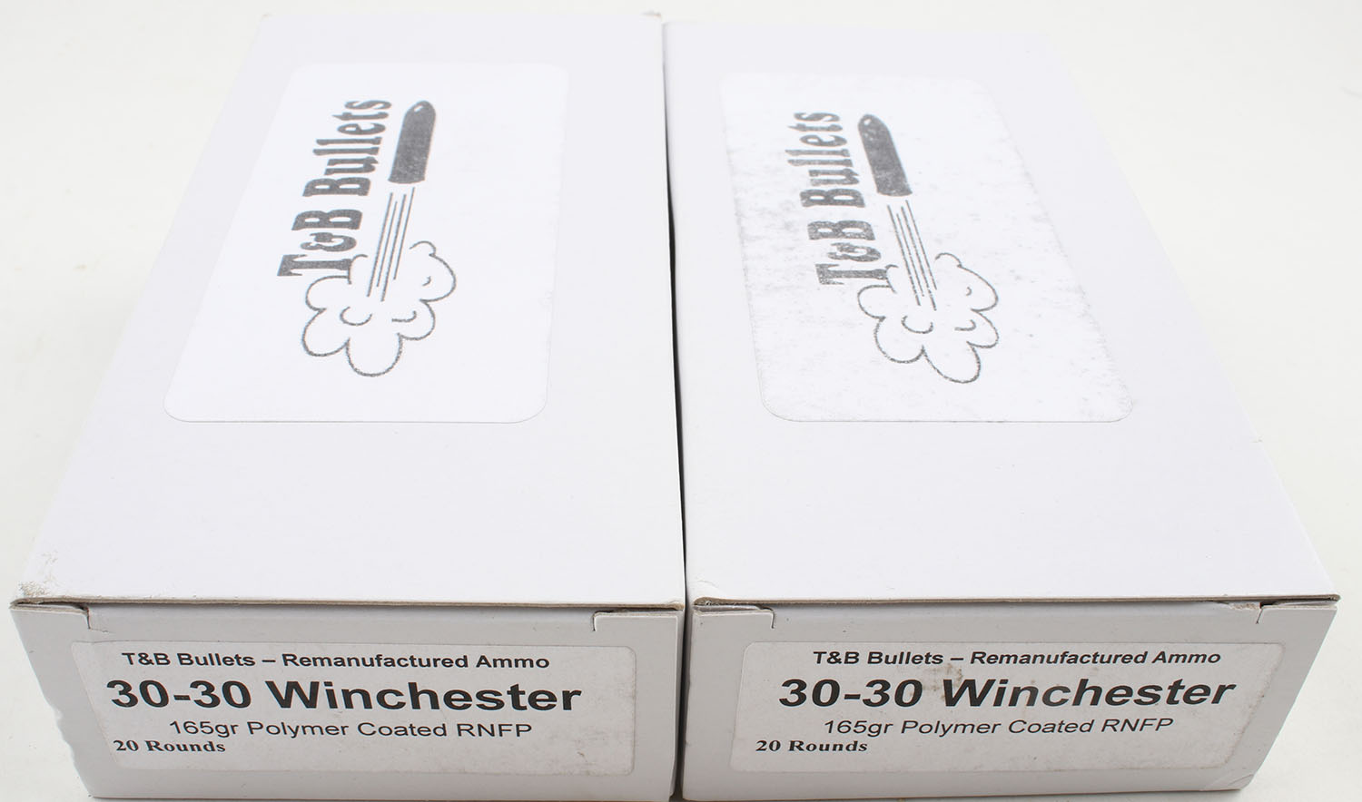T&B Bullets, Lot of (2), .30-30 Winchester ammo boxes, Remanufactured Ammo by a class type 7 Ammo MFG (this is the same class (high quality) as Winchester, Federal and or CCI), 165 Grain Polymer Coated RNFP bullet, loaded cartridges, Full, 1pc, white boxes are very solid, ammo is minty. Grade: Excellent ++ - Value: 20 to 60