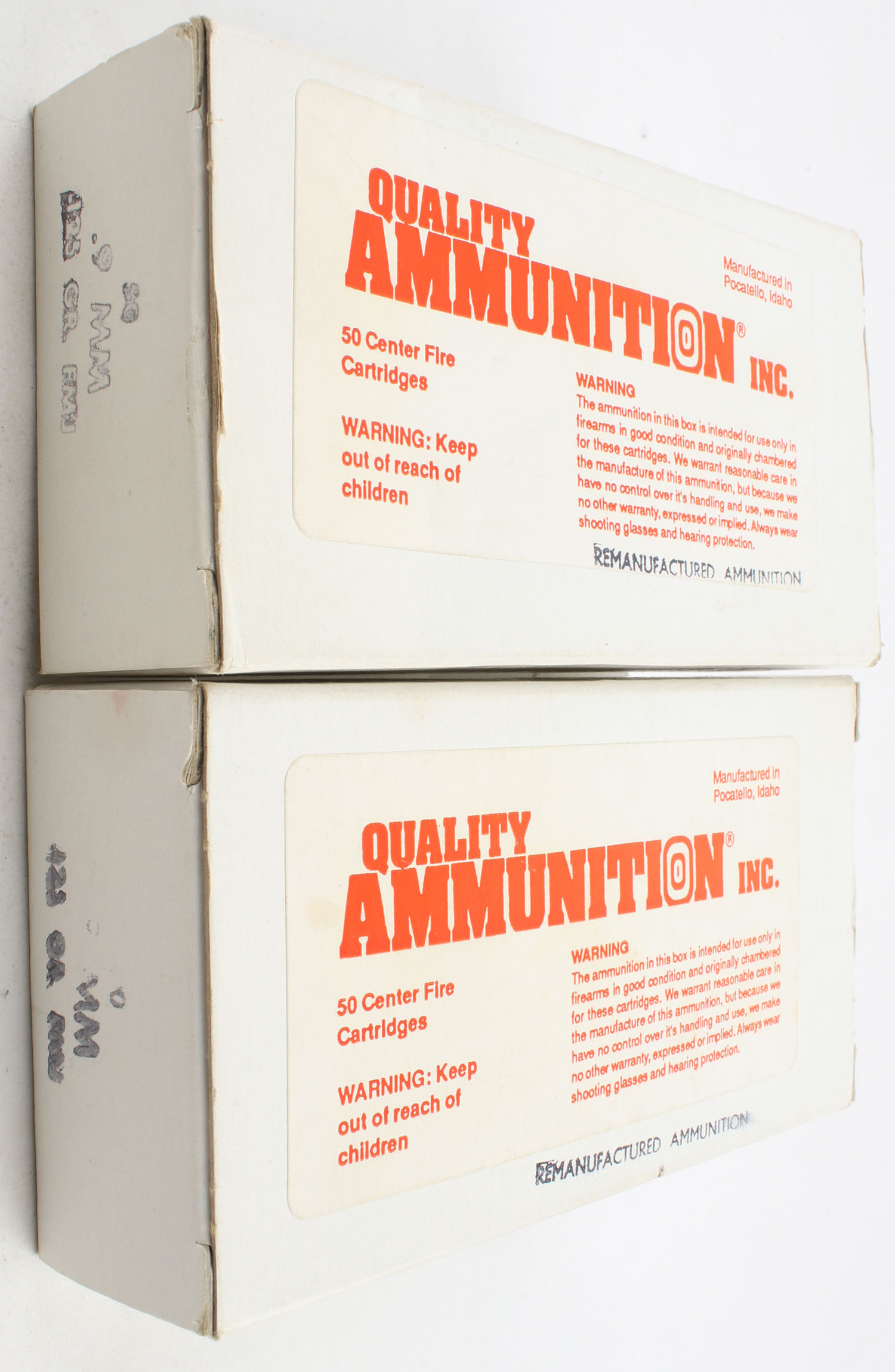 Quality Ammunition Inc., Lot of (2), 9mm, 125 Grain FMJ, Full, 1pc. White boxes with Orange & white label, boxes are very solid, ammo is very good. Grade: Excellent - Value: 10 to 40