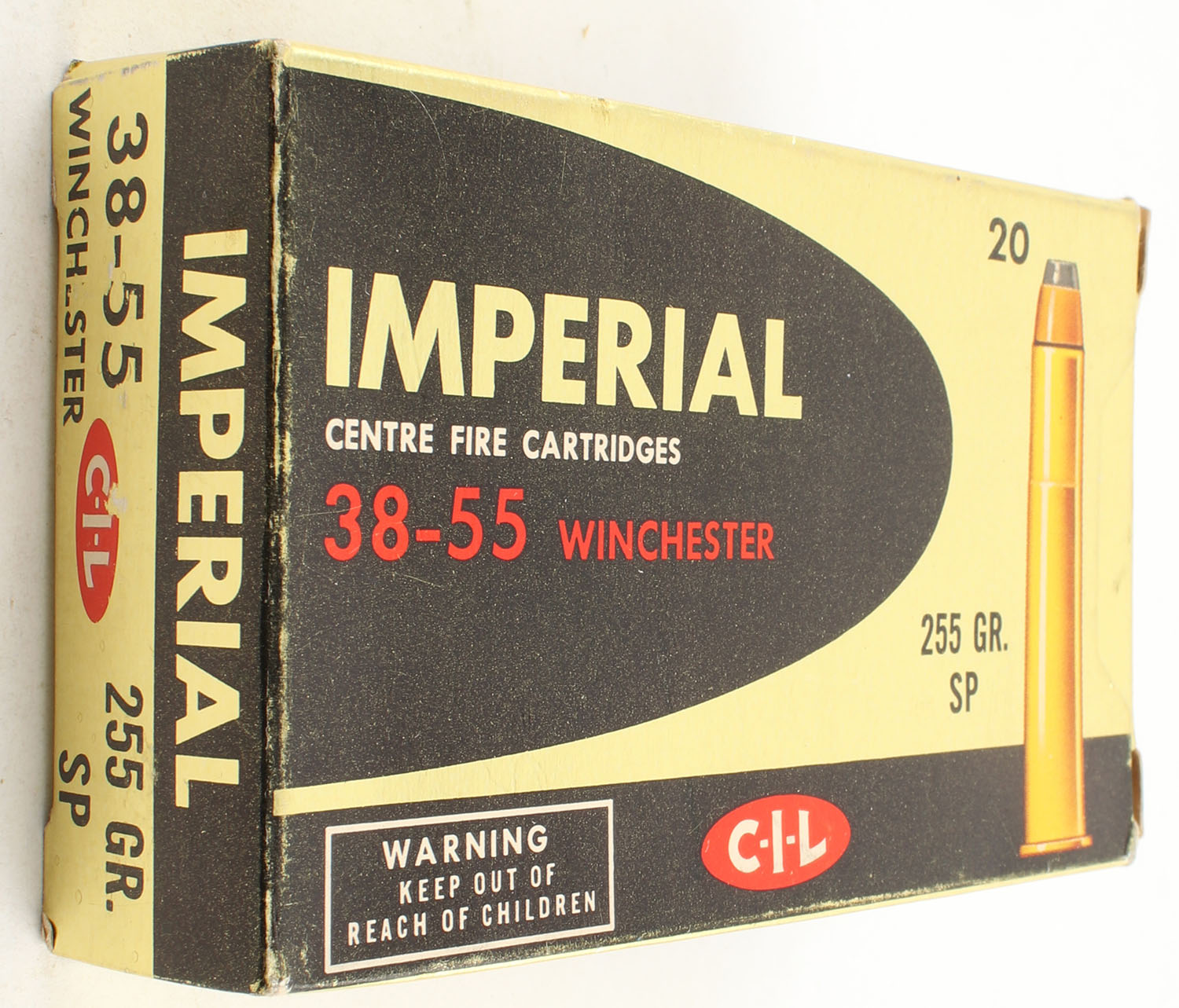 CIL, Imperial, .38-55 Winchester, 255 Grain SP, Full, 1pc. Multi-colored box, box is very solid with excellent color, has light scuffing, minor edge & corner wear, end flaps are solid, ammo is excellent. Grade: Excellent - Value: 40 to 80