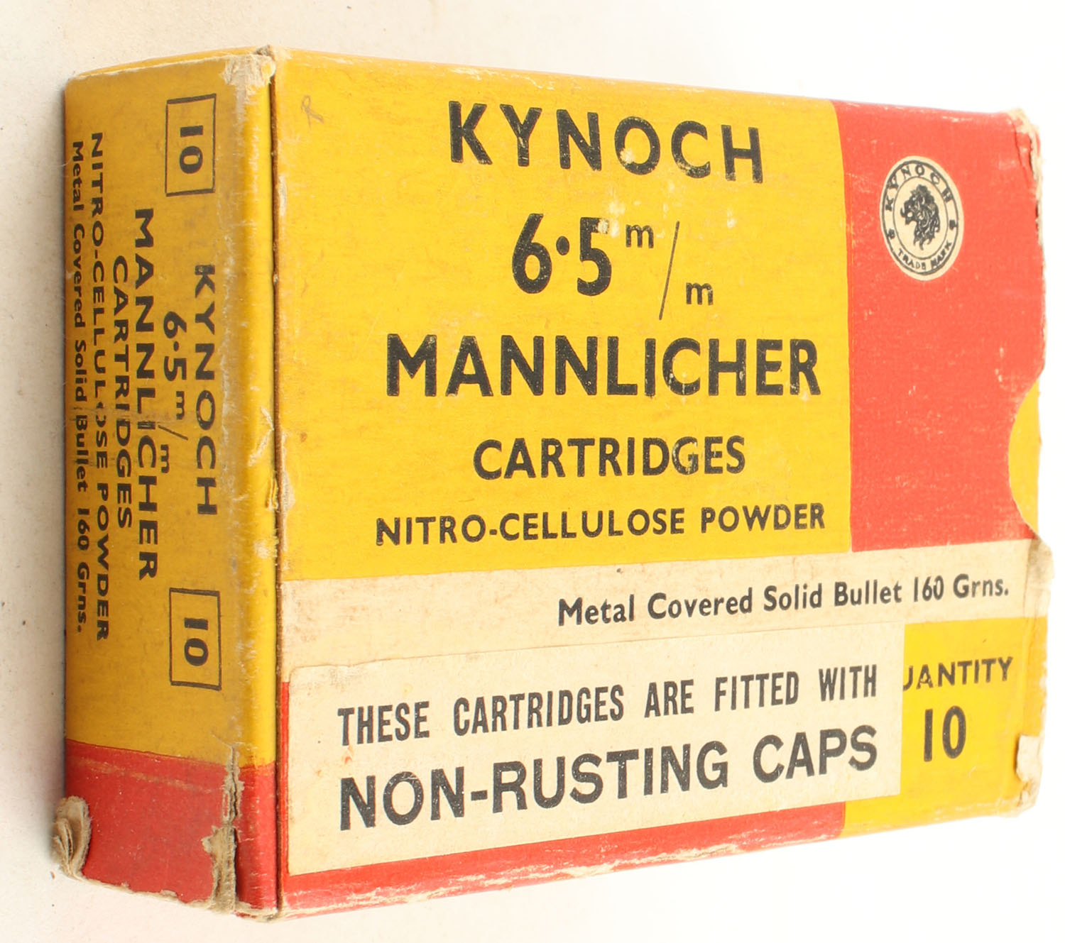 Kynoch, 6.5mm Mannlicher, Nitro-Cellulose Powder, Partial 9rds., 1pc. Multi-colored box, box is solid with good color, ammo is excellent. Grade: Very Good ++ - Value: 10 to 30