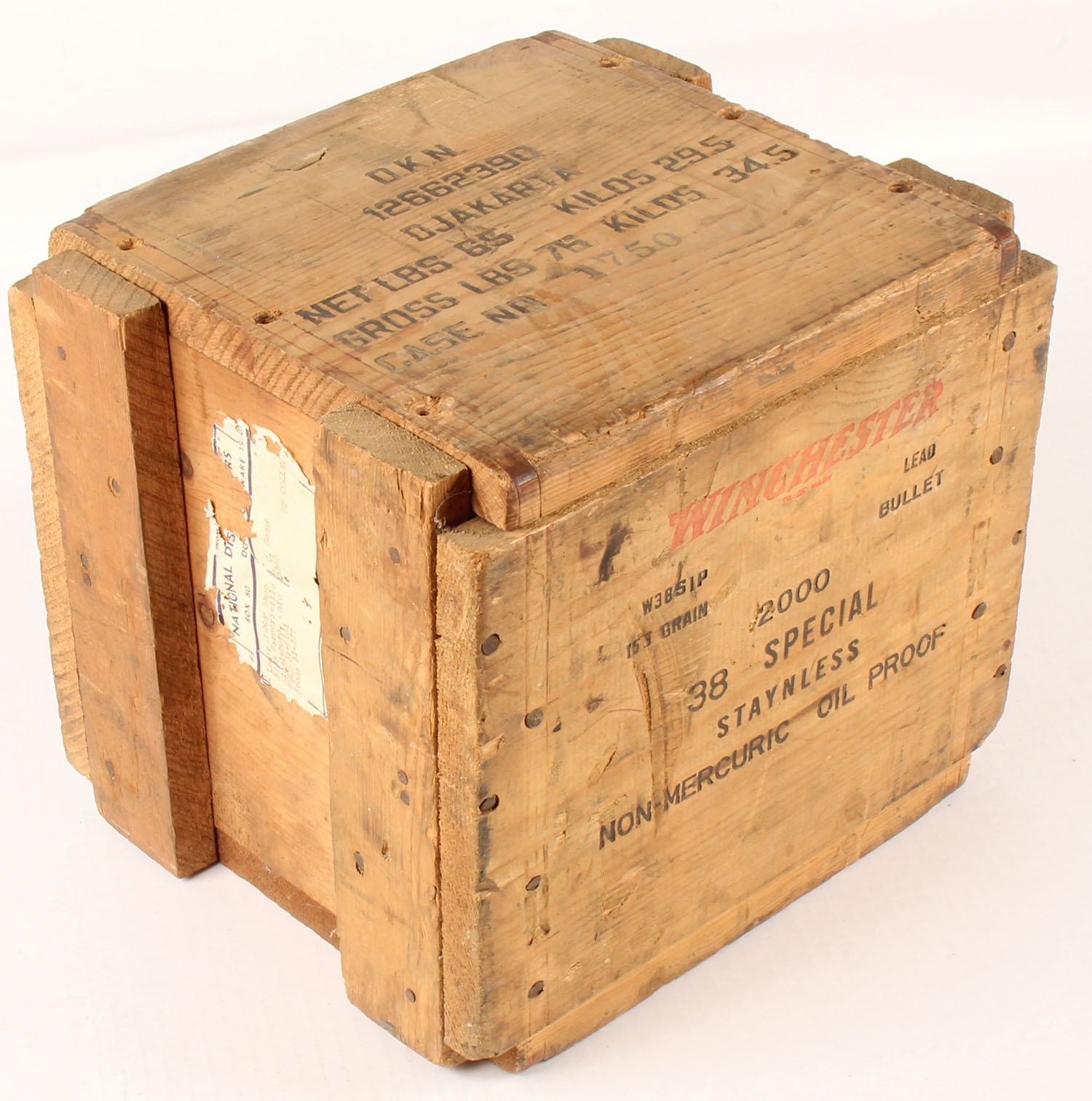 Winchester, .38 Special, 158 Grain Lead Bullet, Partial Wood Crate 2pc., Total of 7 boxes inside crate, (350rds.), 1pc. Boxes, multi-colored boxes are very solid with excellent color, ammo is excellent, crate is solid with red & black print. Grade: Excellent - Value: 100 to 400
