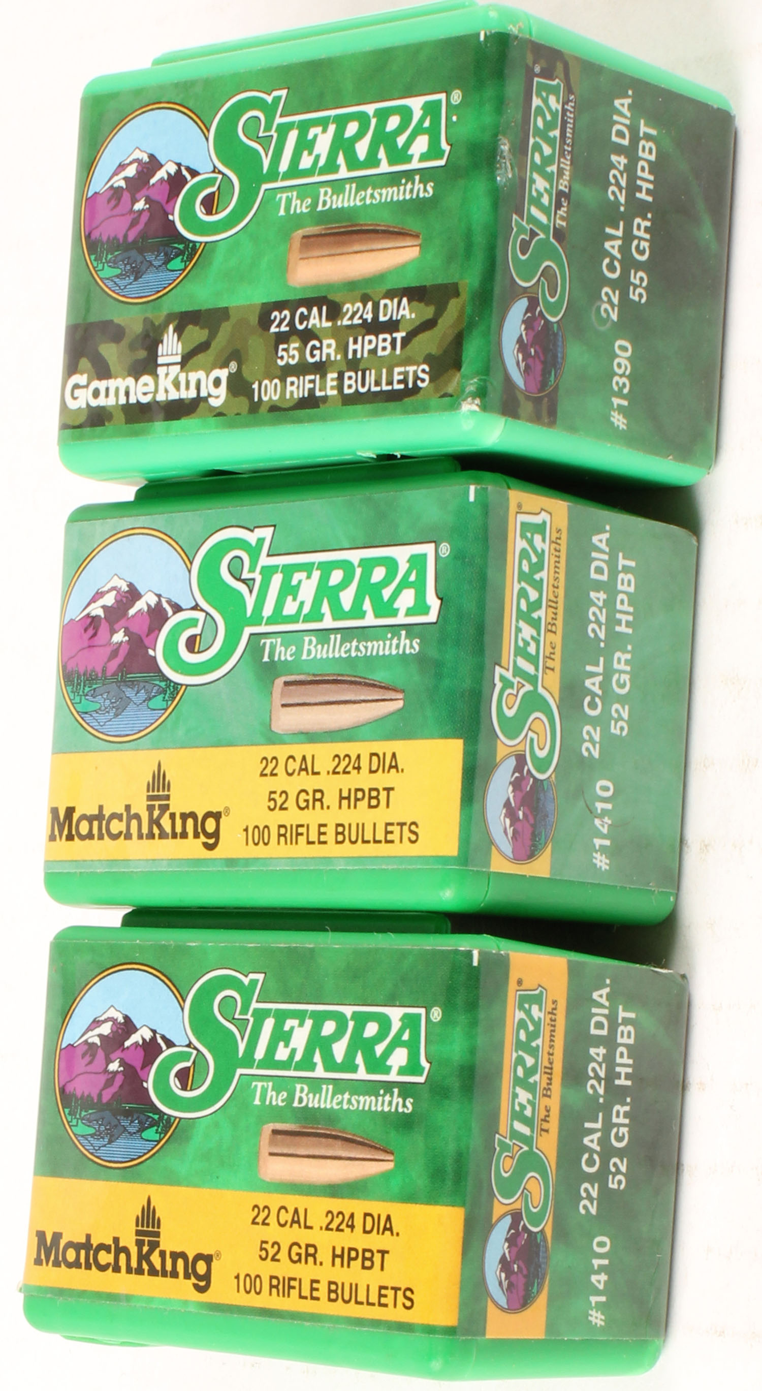 Sierra, 22 Cal., Lot of (3), 52 Grain HPBT, FULL & SEALED, 1pc, Green boxes are minty. Grade: Excellent ++ - Value: 20 to 60