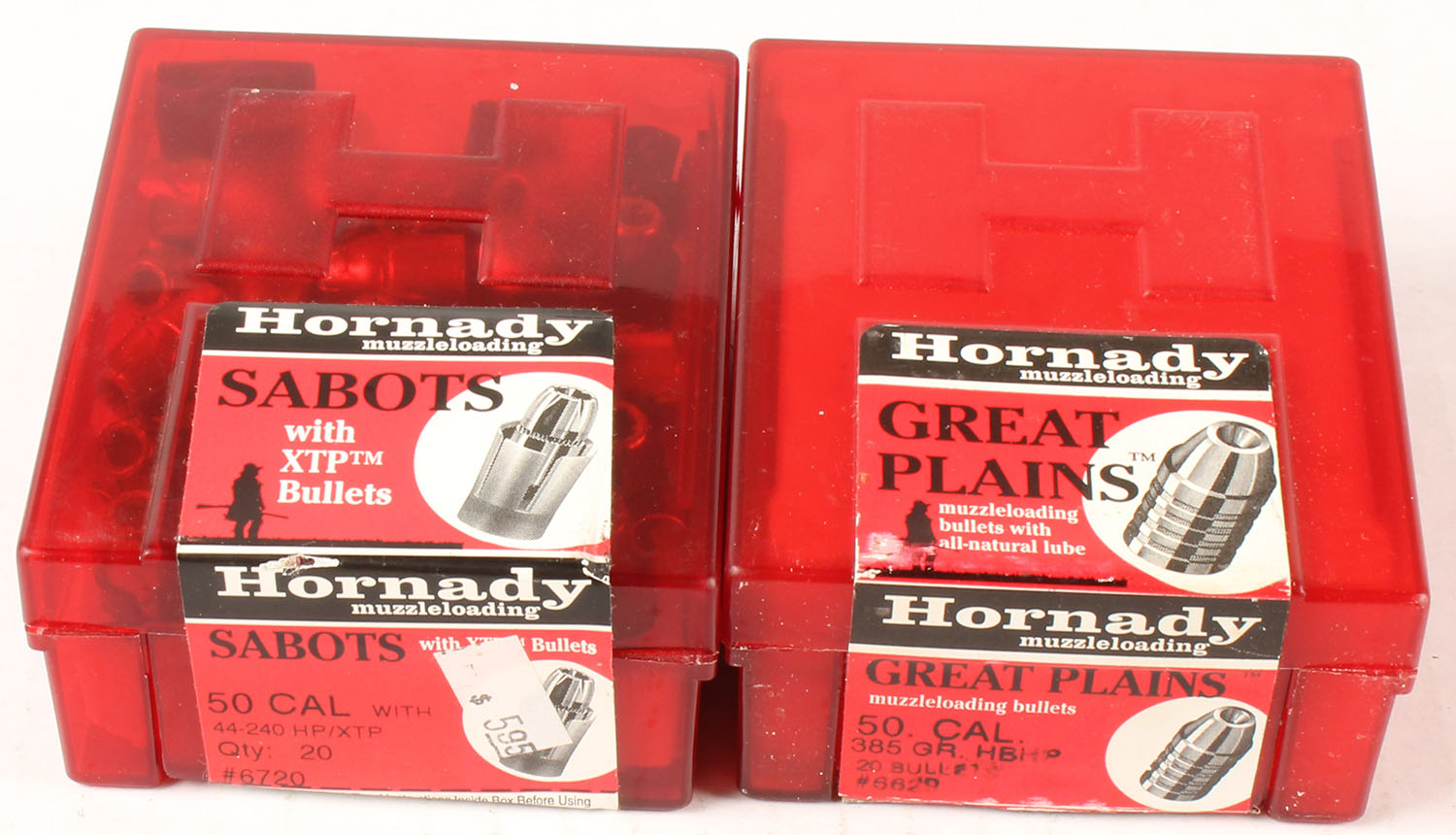 Hornady, Lot of (2), .50 Cal., Great Plains & Sabots, FULL & SEALED, 1pc., Red boxes are very solid, labels are intact. Grade: Excellent + - Value: 20 to 60