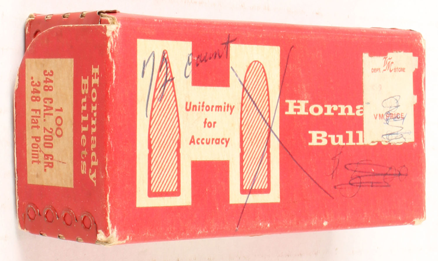 Hornady, .348 Cal., 200 Grain Flat Point, Appears Partial, 1pc. Red box is solid, bullets are excellent. Grade: Very Good ++ - Value: 10 to 40