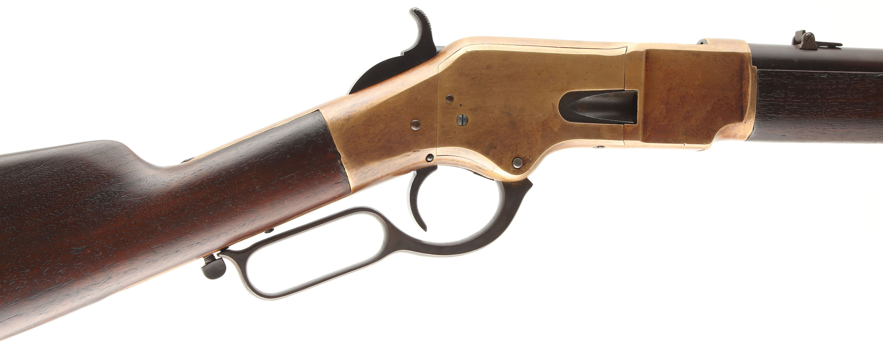 Winchester, Model 1866 Saddle Ring Carbine, 3rd variation, .44 Henry Cal., MFG. 1870, SN: 32417, Lever Action Carbine, 20'' Round barrel, Full mag. The original wood stocks are excellent & solid, displaying a mix of original finish, added finish & some protective oils, all of which give it a wonderful aged & rich tone. There are very few handling marks & light contusions. The top edge on both sides of the forend tip have a spliced sliver of wood replaced to correct previous damage & to restore the edge. This was professionally done & feathered in to match the surrounding wood & finish. There is a tight hairline crack at the forend tip. The fit of the wood to metal is excellent. Overall, the stocks retain an excellent appearance. The metal has an even & rich deep chocolate brown patina. The brass receiver & buttplate are developing a very nice aged patina. Bore is very good, with some areas of cleaned roughness amongst strong rifling. The barrel carries the original flip-up rear sight, with 1,3 & 5 markings for 100, 300 & 500 YDS & a standard pinch blade barrel band front sight. The address atop the barrel is still sharp & very clear. Stock carries a brass flip-up trapdoor crescent buttplate, with a correct 3 piece cleaning rod held within. Staple mounted saddle ring. The SN is block stamped on the lower tang. Tight, smooth action & appears mechanically sound. This 1866 SRC has a great aged appearance & appears well maintained.* Antique, No FFL Req. - - Value: 7000 to 12000