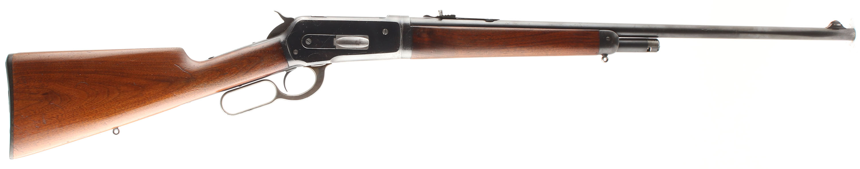 Winchester, Model 1886 TAKE-DOWN, 33 WCF, MFG. 1905, SN: 137474, Lever Action Rifle, 24'' Round barrel, 1/2 mag. The original straight grip stocks are excellent, retaining the majority of the original finish, with thinning at the carry points & minor handling marks, light scratches & contusions. The original metal blue finish 85% on the barrel, 80% on the receiver, with the lever & hammer being case-hardened & displaying muted case-colors. The sliding bolt retains a full 85% of its original bright blue. The barrel is fitted with an adjustable rear sight & a Lyman half moon blade & ivory bead front sight. Bore is excellent & bright. Stock carries a checkered widow's peak plastic shotgun buttplate, with sling eyelets in stock & forend cap. This rifle is an excellent example of an original & collectible 1886. FFL or C&R Req. - Value: 2750 to 4000