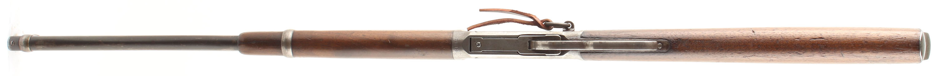 Winchester, Model 1894 SRC, CAL: 30 WCF (30-30), MFG: 1904, SN: 213525, Lever Action Carbine, 20'' Round barrel, Full mag. The straight grip wood stocks are very good & solid, with several tiny to minor scrapes, scratches & contusions to the stocks & the original finish. There are a couple of small missing chips at the top shoulders of the wrist & the receiver, one on each side. There is also a 2'' crack at the forend tip. The metal blue finish has worn mostly guns metal gray, with 20% remaining on the barrel, 30% on the mag tube & the receiver fully worn gun metal gray, with a very thin brown patina. Bore is good, with lots of cleaned roughness amongst strong rifling. The barrel is fitted with a three leaf folding rear sight & carbine box front sight. Stock carries a smooth metal carbine buttplate. Original saddle ring, with leather lash. Smooth tight action. A solid & quality SRC shooter in the popular 30 WCF. FFL or C&R Req. - Value: 800 to 1500