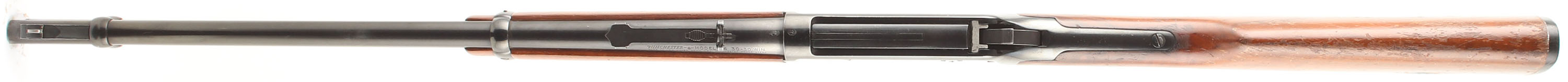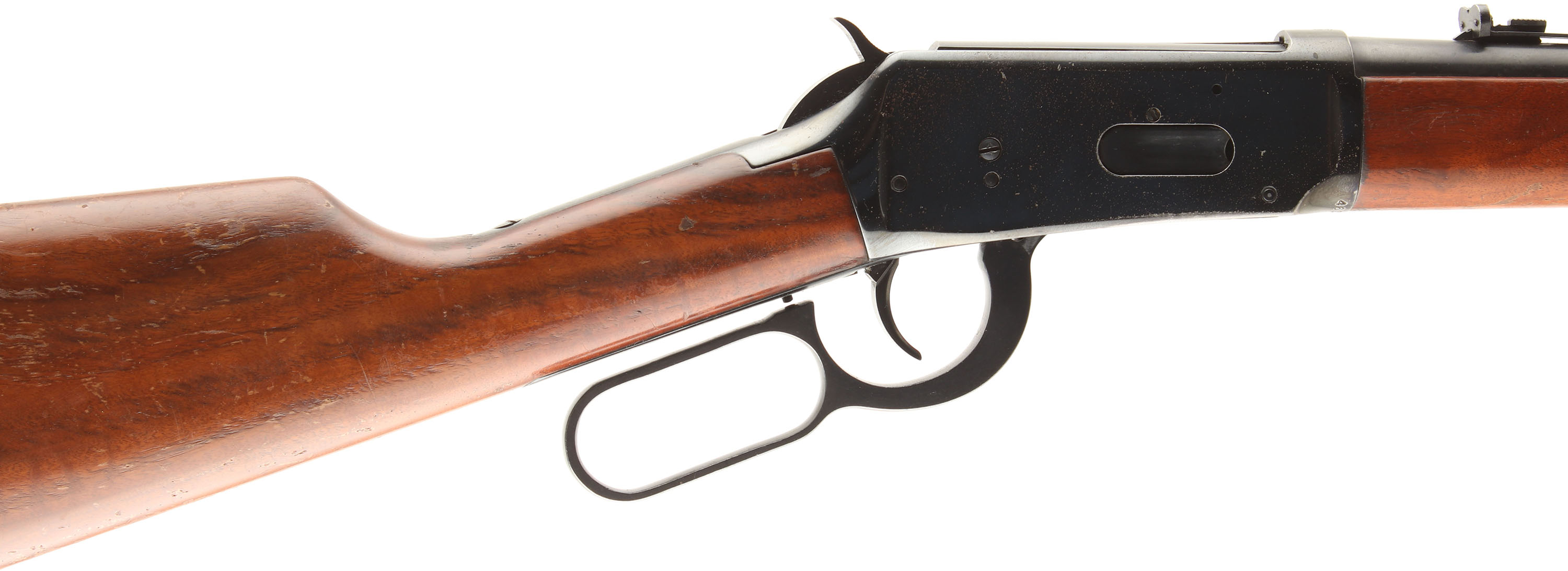 Winchester, Model 94 Carbine, CAL: 30-30 (30 WCF), MFG: 1978, SN: 4639112 , Lever Action Carbine, 20'' Round barrel, Full mag. The straight grip wood stocks are very good & solid, however someone tried to inlay something into the left side of the stock. It now has a large blue plug on the left & a small carved indent on the right. There are other minor handling marks & scratches to the thinning & flaking original finish. The original metal blue finishes rate 90% on the barrel & mag tube, while the receiver rates 80%, with much of the loss being a speckled loss & edge wear. Bore is excellent. The barrel is fitted with an adjustable rear sight & a ramped blade front sight. The left side of the receiver carries the two hole factory provision for receiver side mounted sights. Stock carries a Winchester checkered plastic buttplate. Smooth tight action. A solid & high original condition 30-30 carbine setup ready for the hunt. FFL or C&R Req. - Value: 400 to 800
