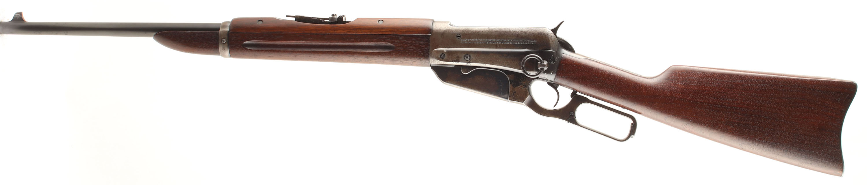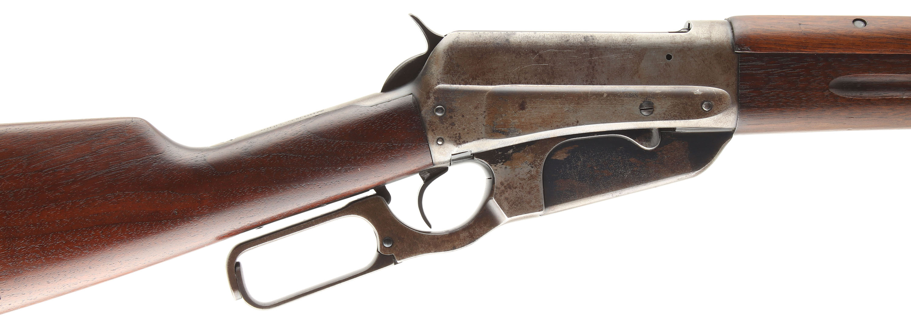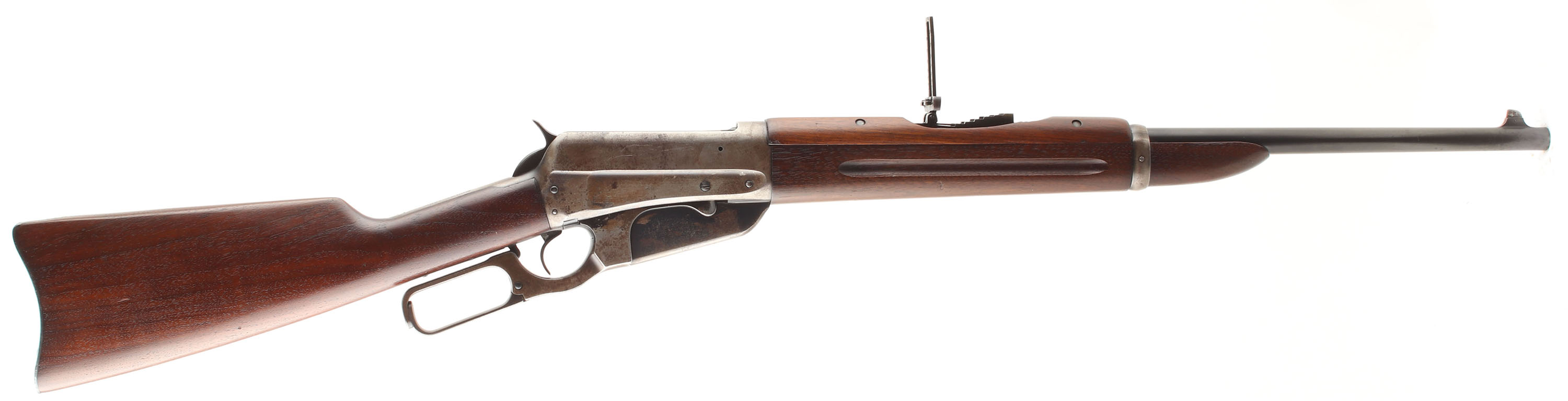 Winchester Model 1895 Saddle Ring Carbine, CAL: 30 GOV. 06 (30-06), MFG: 1919, SN: 404553, Lever Action Rifle, 22'' barrel. The frame at the breech is marked with the WP proof & ''.30GOV'06.'', while the left side is marked with the two line address & patent information, ''MANUFACTURED BY THE WINCHESTER REPEATING ARMS CO. NEW HAVEN CONN. U.S.A. PATENTED NOV. 5. 95. AUG. 17. 97. JAN. 25. 98. AUG. 23. 98. AUG 6. 1907.''. The upper tang is marked, ''Model 1895 Winchester Trade Mark REG. IN U.S. PAT. OFF. & FGN.''. The rifle features the 2/3 length military style forearm, with grasping grooves & military type handguard, & straight wrist stock. The walnut stocks are excellent, displaying few handling marks to the excellent original finish. The original metal blue finish rates 90% on the barrel, while the receiver is worn mostly gun metal gray due to ''Winchester Flaking'', with a thin brown patina developing & remnants of original blue remaining on the sides of the mag & around the saddle ring. The SN & ''B'' are stamped across the lower tang behind the trigger. Bore is excellent, with a bit of haze amongst strong rifling. Barrel holds a pinned blade front sight & folding ladder rear sight graduated 15-32 on the ladder & 6-14 on the stepped base. Buttstock carries the original smooth metal sliding trapdoor buttplate. Saddle ring. A very nice, near excellent, original model 1895 saddle ring carbine. FFL or C&R Req. - Value: 2000 to 3000