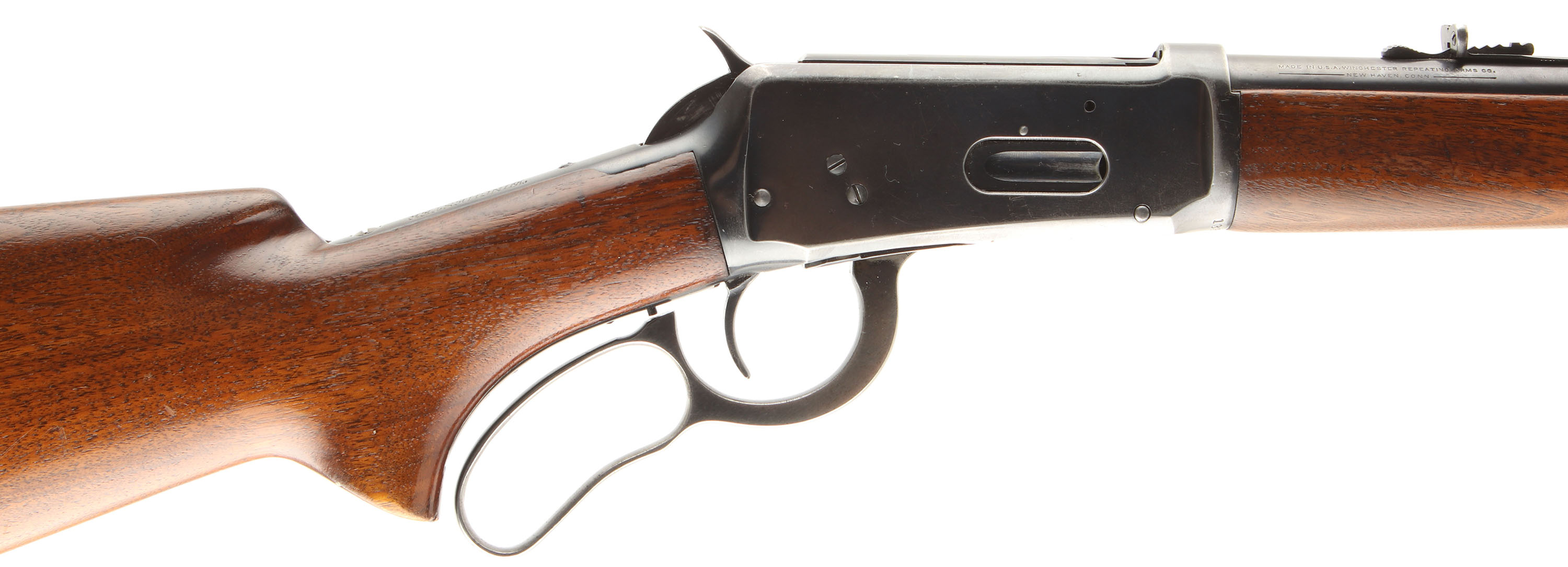 Winchester, Model 64, marked 32 W.S., MFG. 1942, SN: 1331164, Lever Action Rifle, 24 3/8'' Round barrel, 2/3 rd. mag tube. This is one of the rarer & fewer made Winchester models produced, with only 66,783 total rifles. The original flat pistol grip wood stocks are excellent, with a few minor scratches & contusions to the original finish, with a thin added layer. There is a small edge chip, with a bit of fill on the pistol grip edge. The metal blue finish rates 70%on the barrel & receiver, 80% on the mag tube. The barrel carries an adjustable rear sight & ramped blade front sight. Factory widow's peak checkered metal buttplate. Excellent bore. A sharp presenting & fairly rare rifle. FFL or C&R Req. - Value: 1200 to 1800