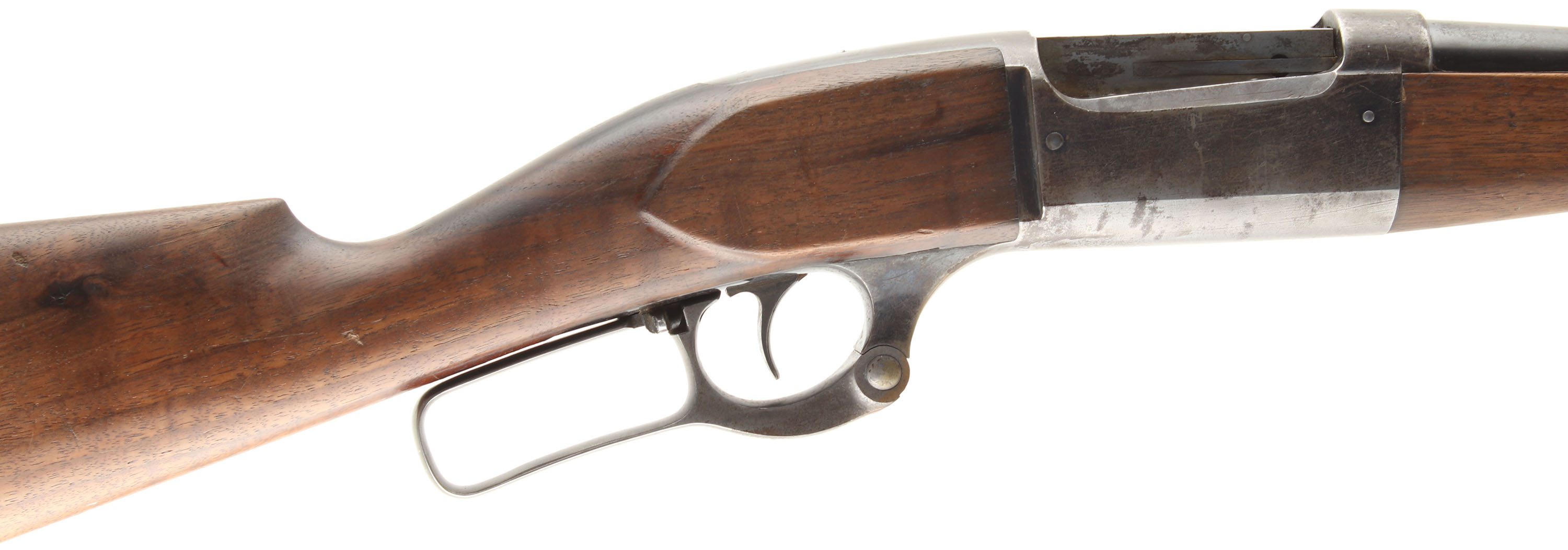 Savage, Model 1899, CAL: 30-30, MFG: 1907, SN: 76885, Lever Action Rifle, 20'' Tapered barrel. The original straight grip wood stock & forend are good & solid. The stock has been cut & there is a large missing chip from a toe break. There are several minor contusions & scrapes to the wood & nearly all the original finish has worn from use. The metal blue finish rates 50% on the barrel, while the receiver & lever have worn mostly gun metal gray, with remnants of original blue in the more protected areas. The internals of the lever display muted case-coloring. Bore is good & bright, but with some cleaned roughness amongst strong rifling. The barrel holds a flip rear sight & block elevated blade front sight. Round counter on left side of receiver. Stock carries a vintage Ranger kick pad that was a garage installation & is likewise also broken at the toe. FFL or C&R Req. - Value: 400 to 600