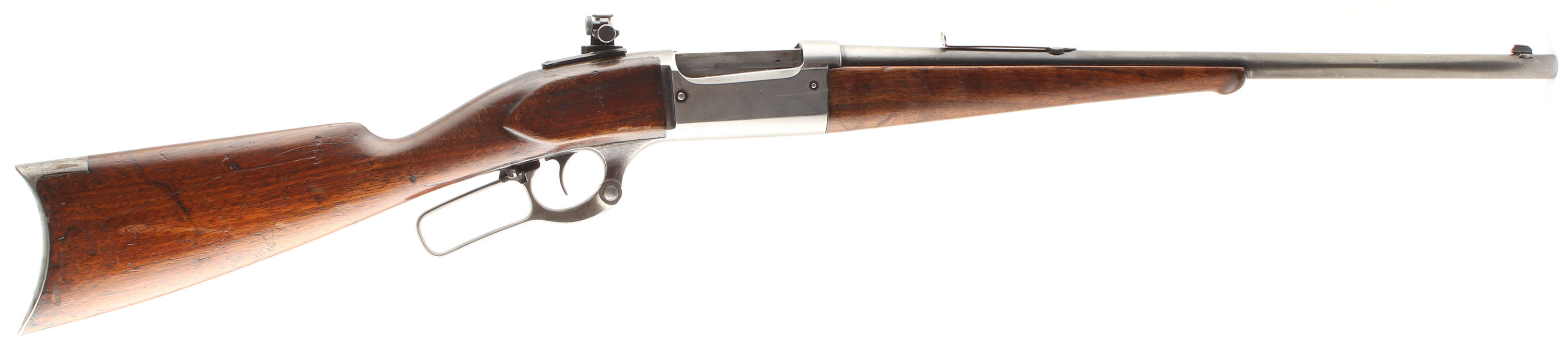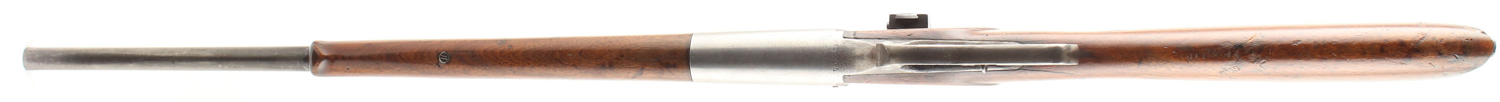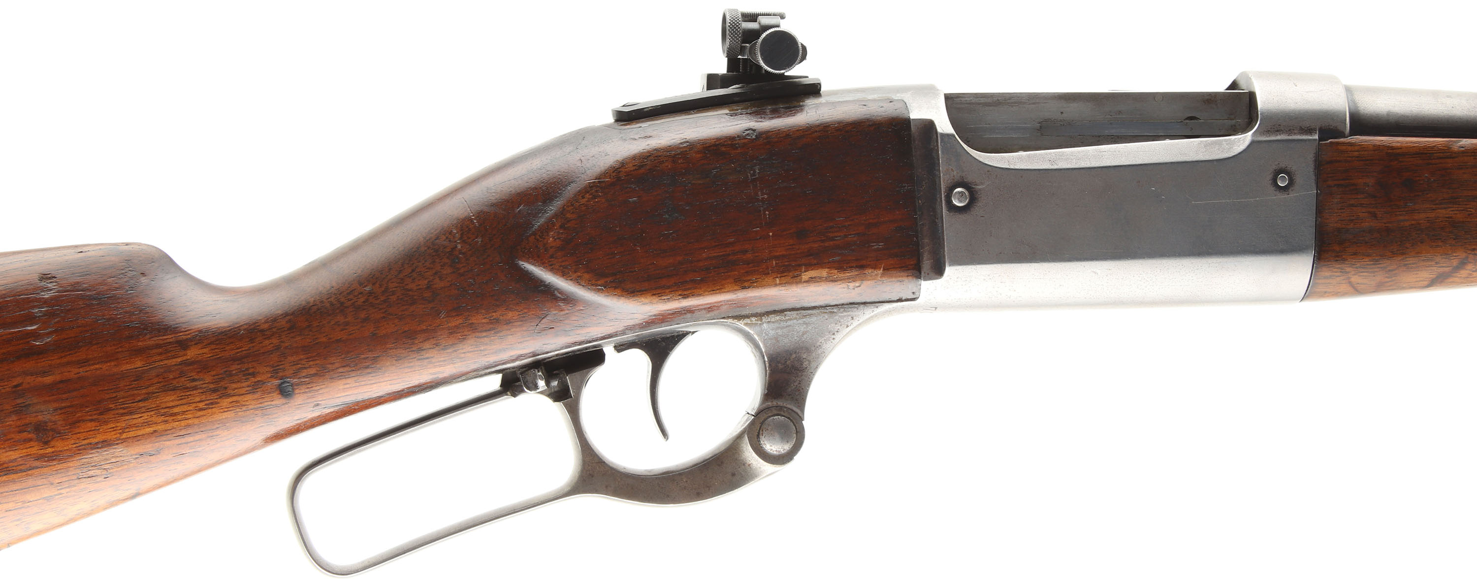 Savage, Model 1899, marked .303 Savage Cal., MFG. 1906, SN: 70024, Lever Action Rifle, 20'' Tapered round barrel, The factory straight grip wood stocks are good & solid, despite a 5'' stress crack emanating from the upper tang running back to the comb & two shorter stress cracks emanating from the tower tang. There is a screw on the left side of the wrist that has stabalized the stock at the wrist. Therewas also a break at the toe which currently has wood fill to maintain the toe shape. There are also numerous small to large scrapes, scratches & contusions & an added layer of finish over the remains of worn original finish. The metal surfaces have worn mostly gun metal gray, with some minor remnants of original blue in the most protected areas. The rifle is fitted with an adjustable Lyman 57AS side mounted receiver sight, while the barrel carries an adjustable rear sight , missing the elevator, & a Marble Sheard blade front sight. Bore is very good. The stock carries the original crescent metal buttplate. Likely a good shooter. FFL or C&R Req. - Value: 400 to 800