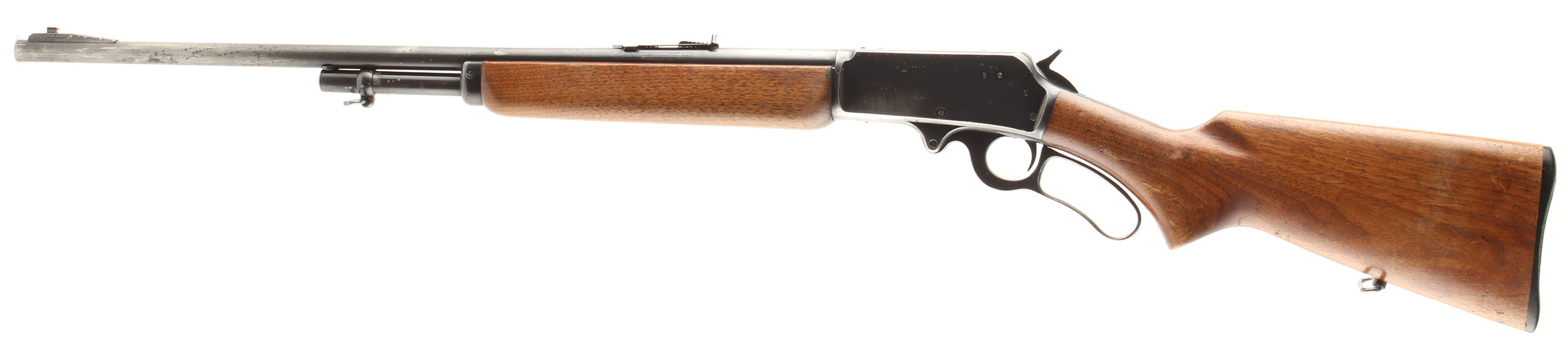 Marlin, Model 336-A, CAL: 30-30, MFG: 1954, SN:G10761, Lever Action Rifle, 24'' Round barrel, Full mag. The smooth flat pistol grip wood stocks are excellent, with several minor handling marks, light scratches & contusions to the original finish, which is thinning some from use. The metal blue finish rates 50% overall. Bore is excellent & bright. The barrel has an adjustable rear & a ramped blade front sights. Stock carries a Marlin checkered plastic buttplate. Sling loops. A quality lever action hunting rifle. FFL or C&R Req. - Value: 400 to 800