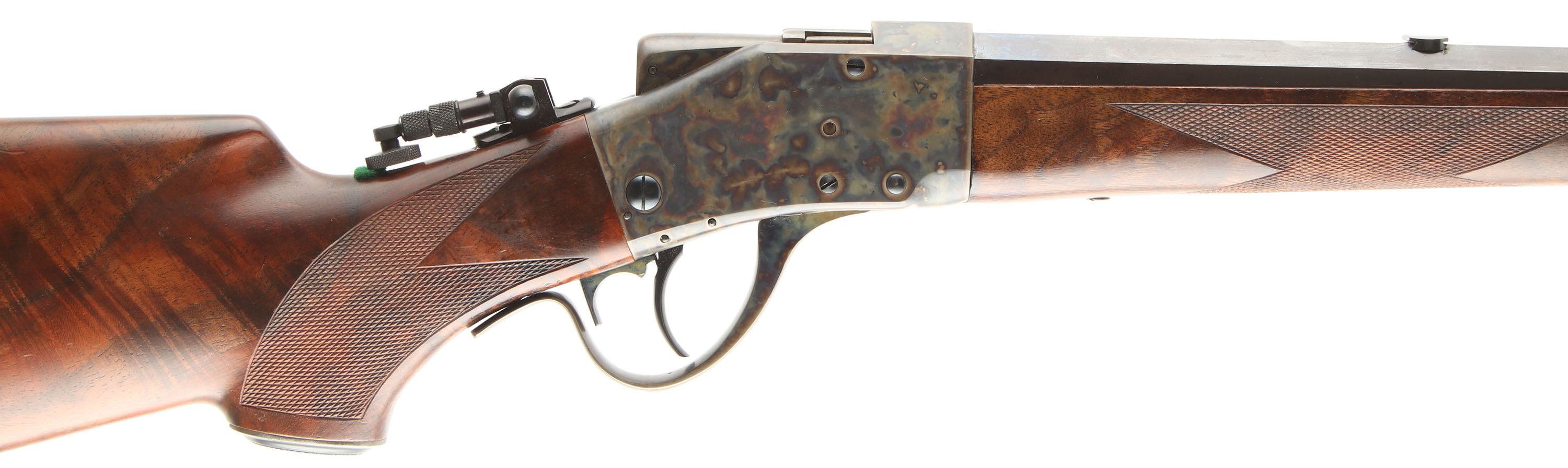 Sharps Rifle Co,, Model 1878 Borchardt,, .32-40 Ballard Caliber, MFG: Antique 1878-81, SN: 18182, Falling Block Shot Rifle, 30'' Octagon to round barrel. This is a custom restored antique rifle. The left side of receiver is marked ''Borchardt Patent. Sharps Rifle Co. Bridgeport Conn. U.S.A. 18182 Pat. Dec. 1876.'' The custom checkered, cheeked & capped pistol grip stock & schnabel forend are excellent, however there is a 2'' stress crack/break running off the end of the upper tang & down the left side of the wrist. Very few minor handling marks to the excellent finish & sharp checkering. Excellent grain. The barrel is stamped ''Remington Arms Co. Ilion. N.Y.'' on the upper flat, while the bottom flat under the forearm is stamped ''32.40 B.'' & a has a series of numbers under the lever spring. The barrel blued finish rates 70%, with loss due to density thinning. The case-hardened receiver, block & lever all display fantastic case-colors. Bore is excellent & bright. The receiver carries a Lyman disk aperture tang sight, while the barrel carries a blank filled rear sight provision & a globe & post front sight. Buttstock carries a widows peak, checkered metal buttplate, which matches the pistol grip cap. A sharp looking custom restored/built antique rifle. Antique, No FFL Req - Value: 1500 to 3000
