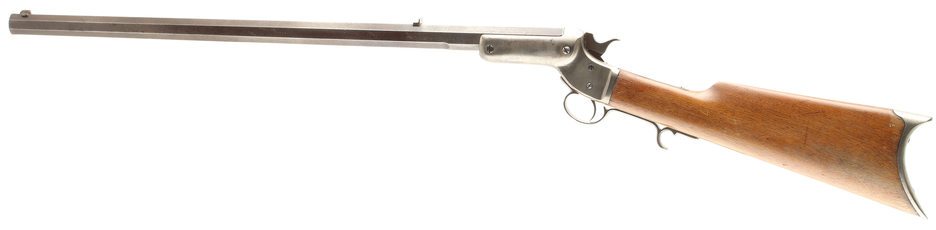J. Stevens & Co., Model No. 1 Tip-Up Rifle, Cal: 32 RF, MFG: 1870's-88, SN: 5389, Single shot, tip open, 24'' Octagon barrel, The original straight grip wood stock is very good, having been sanded & refinished. There are with several light scratches, scrapes & contusions remaining, & the finish shows thinning in areas. This model produced without a forend. Left side of barrel is marked ''J. STEVENS & CO. CHICOPEE FALLS.MASS. PAT.SEPT.6.1864''. The metal blue finish to the barrel has worn & toned to an even thin brown patina. There are numerous small chatter marks or abrasions to the flats of the barrels. The receiver carries a nickel finish. Spur trigger guard. The barrel carries a fixed rear & small blade front sight. Bore is fair, with lots of roughness & pitting amongst worn rifling. Stock carries a crescent metal buttplate. This solid representative example of the early Stevens tip-up rifle. Antique, No FFL Req - Value: 400 to 800