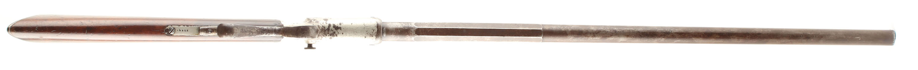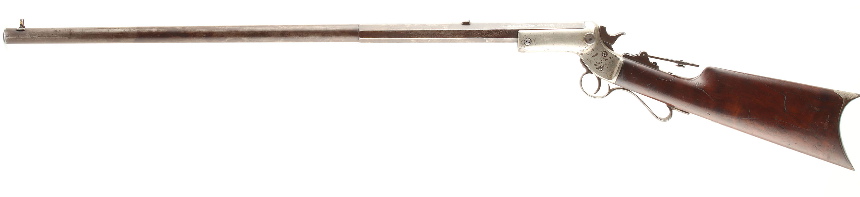 J. Stevens & Co., Model No. 4 Gallery Tip-Up Rifle, Cal: 22 RF, MFG: 1870's-88, SN: 214488, Single shot, tip open, 30'' Octagon to round barrel, The original straight grip wood stock is excellent, but with numerous minor to small scratches, scrapes & dings to the original finish. This model produced without a forend. Left side of barrel is marked ''J. STEVENS & CO. CHICOPEE FALLS.MASS. PAT.SEPT.6.1864''. The metal blue finish on the barrel has worn away & toned to a mix of gun metal gray & a thin brown patina. The nickel finish on the receiver is showing wear, with areas of loss developing a spotty brown patina. Scalloped trigger guard. The receiver is fitted with a large sliding disk flip-up Vernier tang sight, while the barrel carries a fixed rear & folding globe front sight. Bore is good, with areas of pitting & roughness amongst thinning rifling. Stock carries a crescent metal buttplate, retaining some original nickel. A very nice representative example of the early Stevens Gallery tip-up rifle, with factory special order sights. Antique, No FFL Req - Value: 600 to 1000