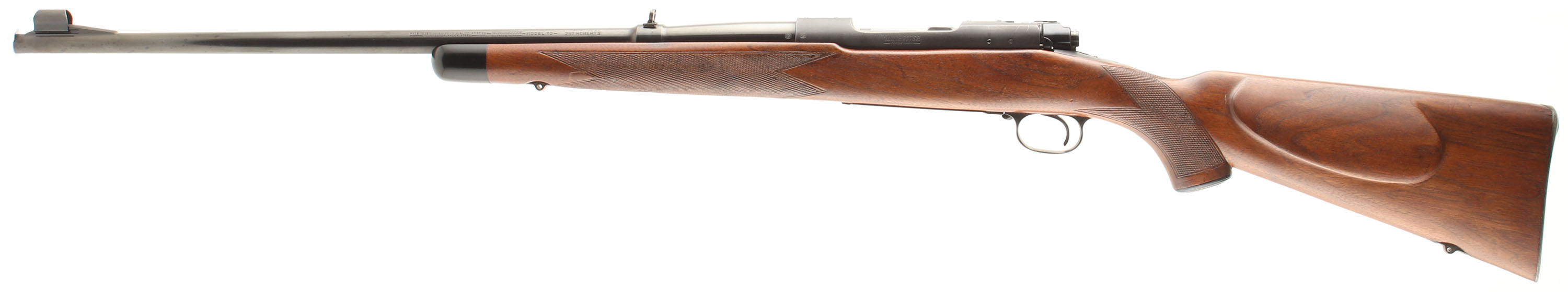 Winchester, Model 70 Super Grade, CAL: 257 Roberts, MFG: 1951, SN: 179009, Bolt Action Rifle, 24'' Round tapered barrel. The factory walnut wood stock has the Super Grade raised cheek piece, deluxe wrap-around checkering, plastic pistol cap & ebony forend tip. The stock appears to have been cleaned & carries the original finish, with added oils some time ago. There are minor scratches, scrapes & handling marks. The original metal blue finishes rate 90% on the barrel & receiver, while the floorplate & trigger rate 70%. Bore is excellent & bright. The barrel holds a folding leaf flip-up rear & a hooded ramp front sight. The receiver is factory tapped for scope mounts. SN matching bolt. Buttstock carries the original widow's peak, checkered metal buttplate. Sling provisions. A collectible Super Grade model 70 in one of the rarer or more expensive calibers amongst collectors. FFL or C&R Req. - Value: 2500 to 4000