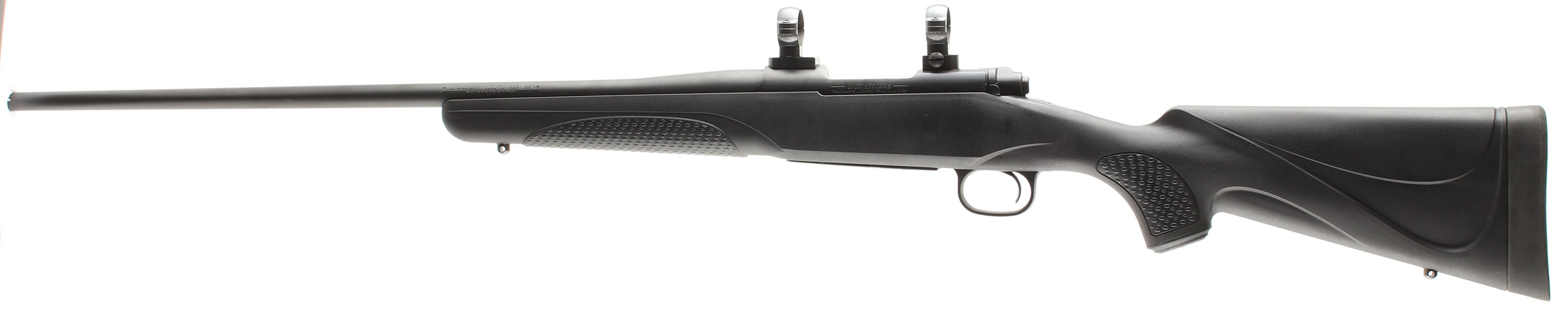 Winchester, Model 70, CAL: Marked 223 WSSM, MFG. 2003-2006, SN: G2516646, 22'' Round tapered barrel. The original black synthetic stock, with a flat pistol grip & textured grips is excellent, with few very minor rubs. The original metal blued finishes rate 99% overall. Bore is excellent & bright. The receiver carries Burris scope blocks & rings, while the barrel has no provisions for open sights. The stock carries the original solid rubber recoil pad. Sling studs. Jeweled bolt, with matching SN. A great all weather model 70 hunting rifle. FFL Req. - Value: 500 to 800