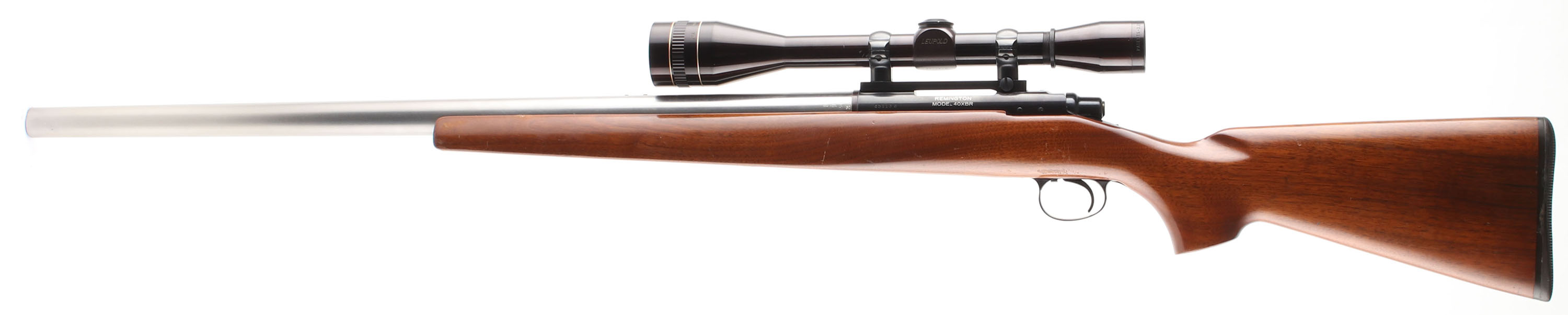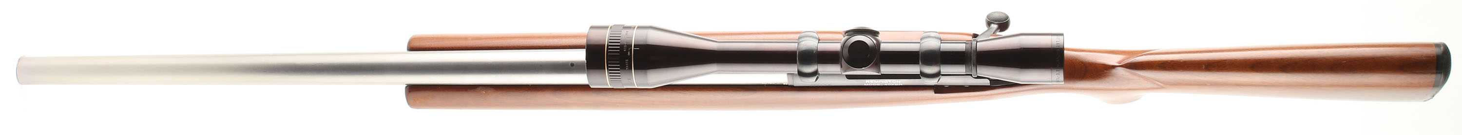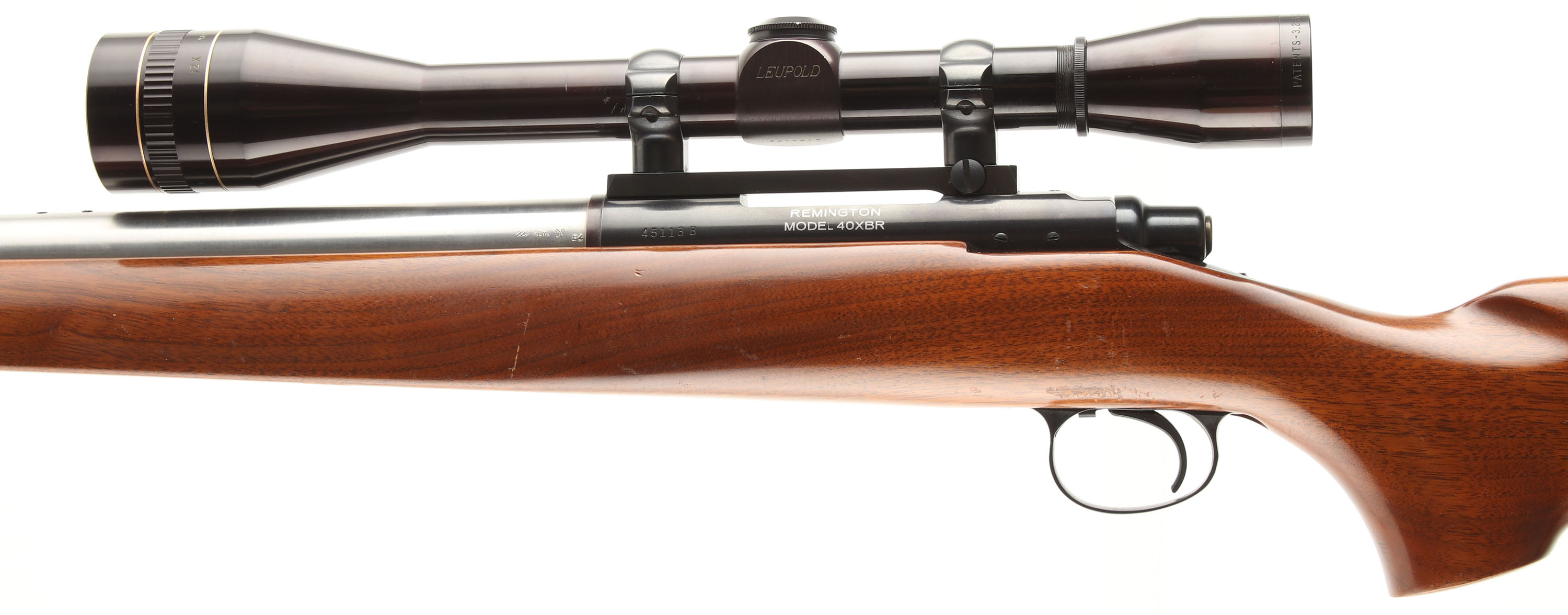 Remington, Model 40-XBR Rangemaster Centerfire Single Shot, CAL: 223 REM, MFG: 1975, SN: 45113B, Bolt Action Single Shot Rifle, 26'' barrel. Built by Remington Custom Shop. The original flat pistol grip & wide forend grip target style stock is excellent. There are a few handling marks to the finish. The bright finished stainless steel barrel is excellent. The metal blue finish on the receiver rates 90%. Bore is excellent. The receiver carries a Leupold 12X scope, held by a Leupold base. Stock carries a Remington solid recoil pad. Jeweled bolt. A must-have rifle for bench or target shooters. FFL or C&R Req. - Value: 800 to 1500