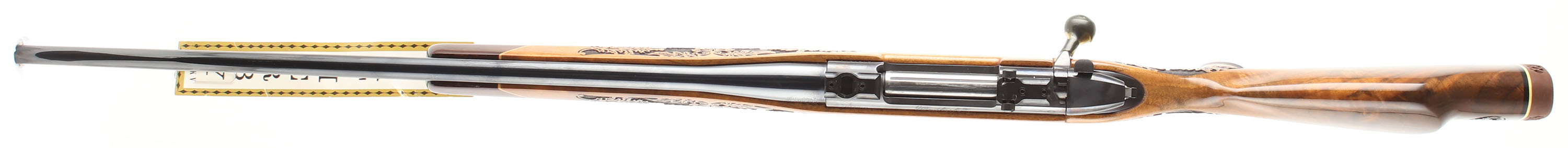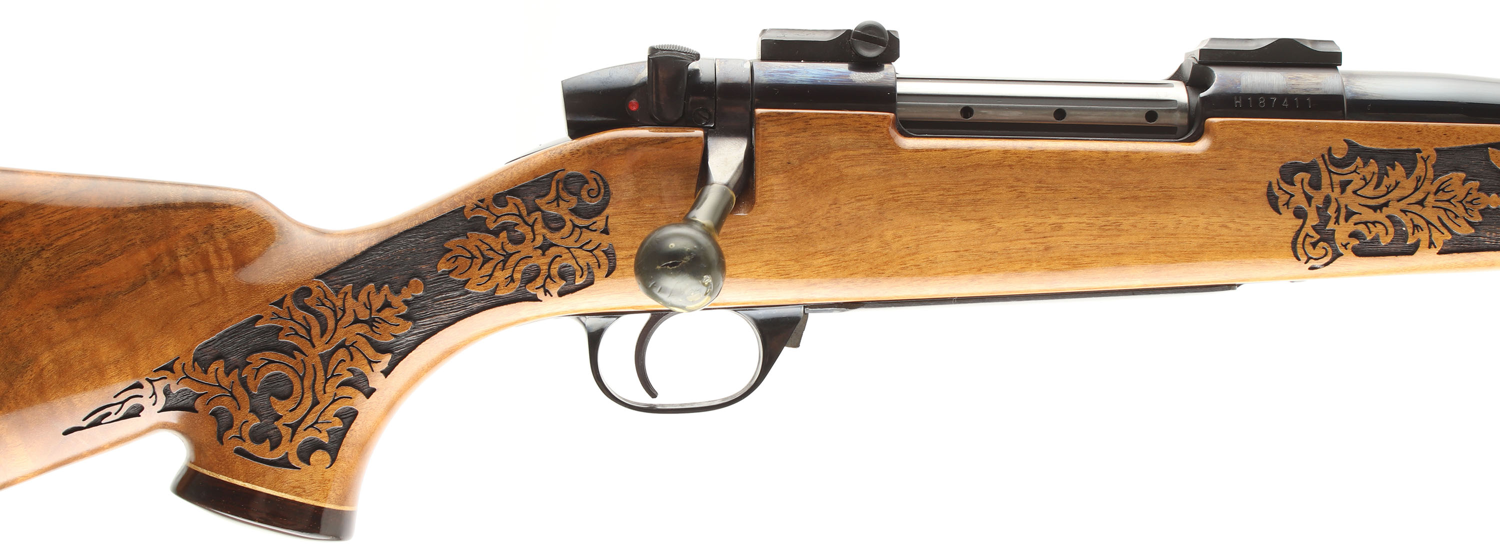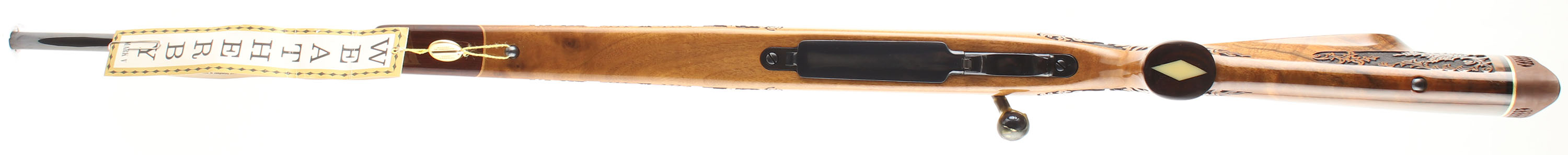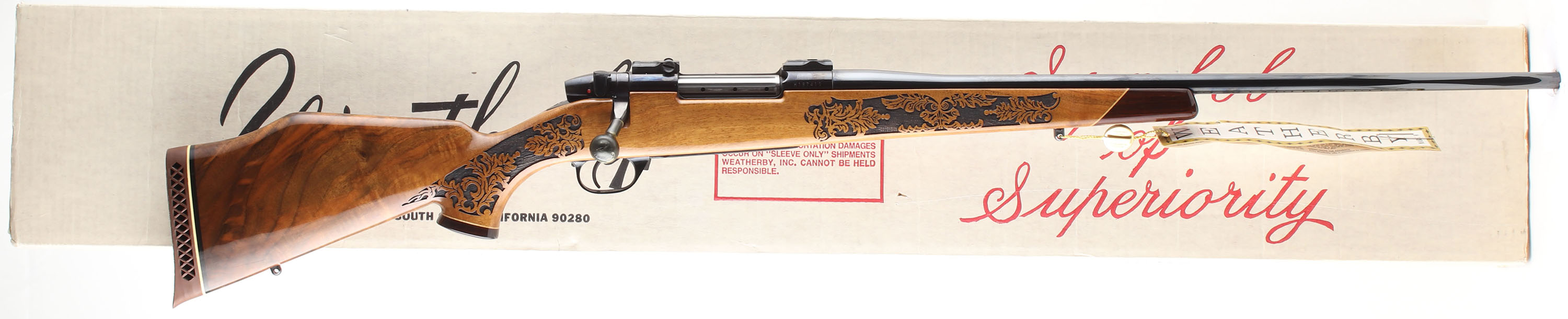 BOXED Weatherby, Mark V Lazermark, CAL: 270 WBY MAGNUM, MFG: 1985, SN: H187411, Bolt Action Rifle, 24'' barrel, Japan production. This gun was gun store owner vintage backstock that remained in the box & was never assembled. The hang tag remains on the forend & original grease was removed for pictures. Has the original rubber protective coating still on the bolt handle. The original cheeked & Monte Carlo stock is excellent, with carved grips & rose wood forend tip & pistol grip cap. There are virtually no handling marks to the excellent original finish. The original metal blue finish rates 100% overall. Bore is excellent. The receiver carries Weatherby scope mounts, while the barrel has no open sight provisions. Stock carries a Weatherby ventilated recoil pad. Sling studs. Comes in the original SN matching box, with paperwork. Basically a NOS firearm. An overall minty & sharp looking carved Mark V. FFL Req. - Value: 1500 to 3000