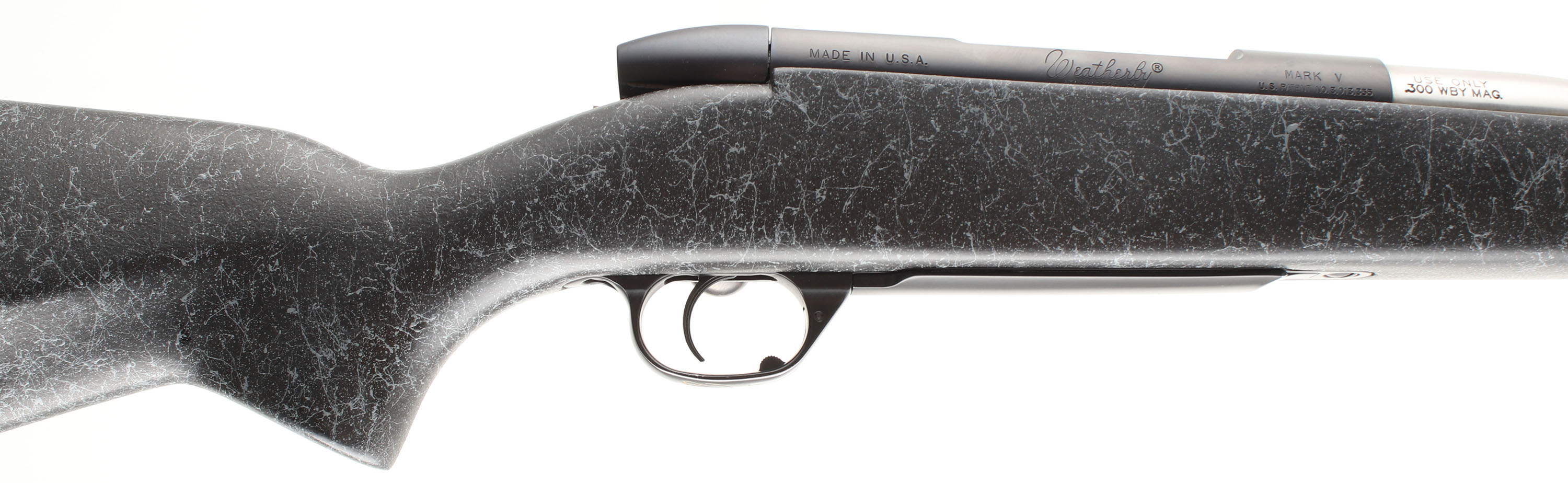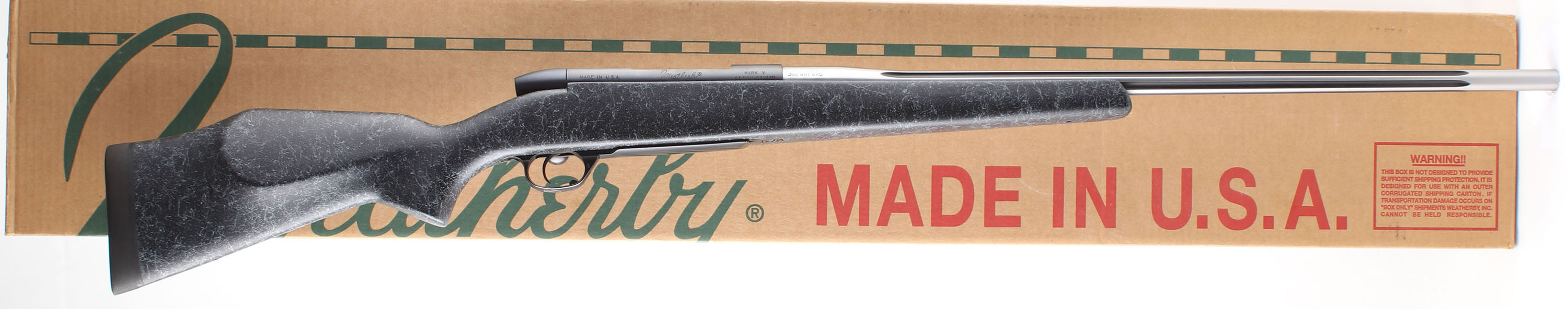 BOXED LEFT HANDED Weatherby, Mark V ACCUMARK, CAL: 300 Weatherby Magnum, MFG: 1995-2004, U.S.A., SN: SB057557, Bolt Action Rifle, 26'' Stainless fluted barrel. The original cheeked & pistol grip, hand-laid, raised Monte Carlo fiberglass stock, with matte gel coat & spiderweb accents is excellent. The 2-toned black & silver, Spun Stainless w/ Graphite Black Cerakote, fluted barrel is excellent both on exterior & bore. The factory metal blue finish rates 99% overall. The receiver has four open factory provisions for future scope mounting, with no open sight provisions on barrel. Stock carries a Decelerator solid recoil pad. Sling studs missing. Nearly new backstock inventory of gun store owner. Comes in the factory SN matching box, with paperwork. A high quality LEFT HANDED hunting rifle in overall excellent condition. FFL Req. - Value: 1500 to 2200