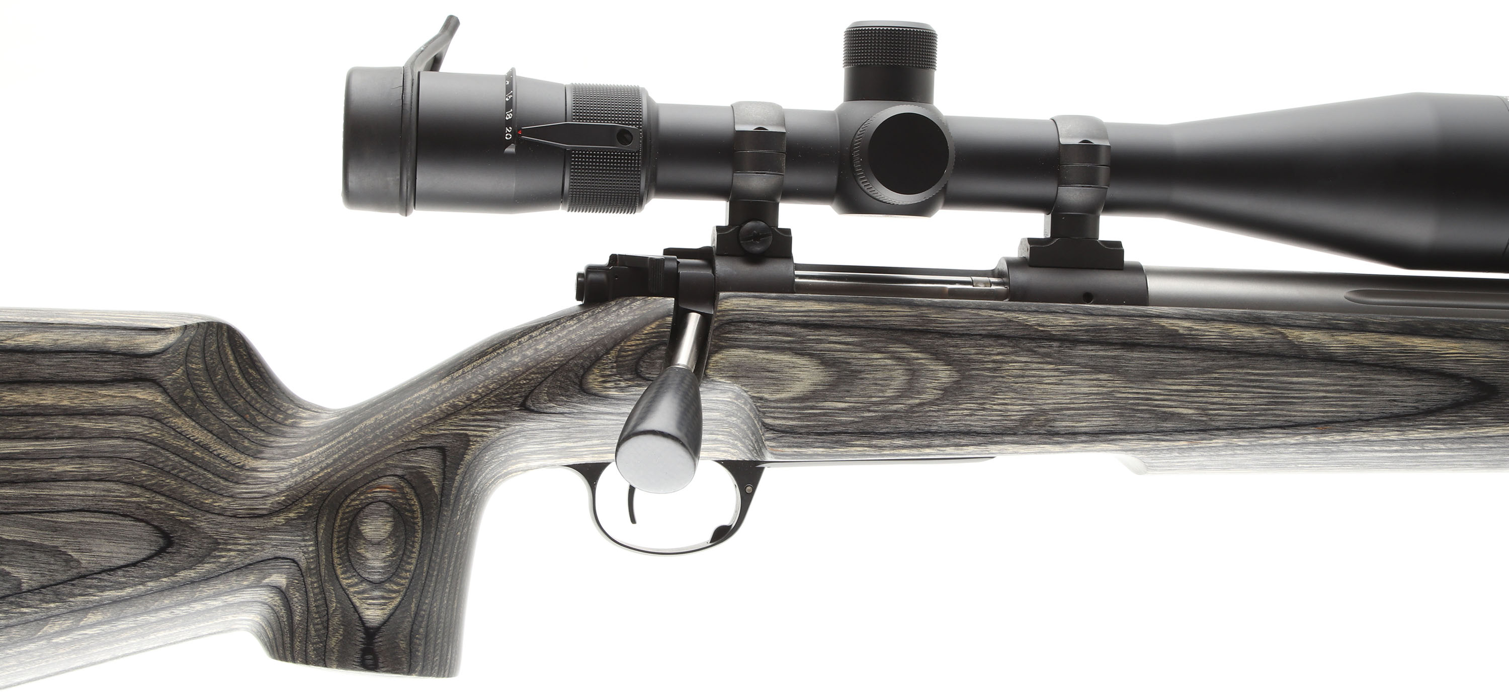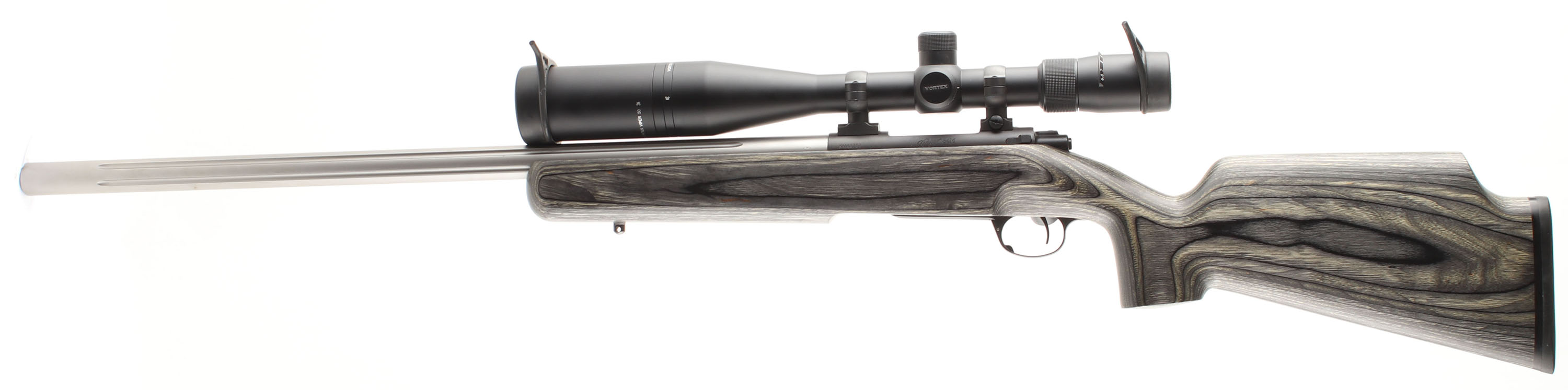 Kimber (NY), Model 84M Longmaster VT, CAL: 22-250 REM, MFG: Modern, SN:KM43757, Bolt Action Rifle, 26'' barrel. The grey, tan & black laminated & flat pistol grip wood bench stock is excellent, with a couple of minor rubs to the excellent original finish. The factory stainless steel fluted heavy barrel is excellent. The original metal satin blue finish on the receiver rates 99%. Bore is excellent. The receiver holds a Vortex Viper 6.5-20X50 Long Rang scope mounted on Leupold mounts, with sun screen & rubber caps. No open sight provisions. Carbon fiber bolt handle. Buttstock carries a Kimber solid recoil pad. Sling studs. FFL Req. - Value: 1400 to 2000