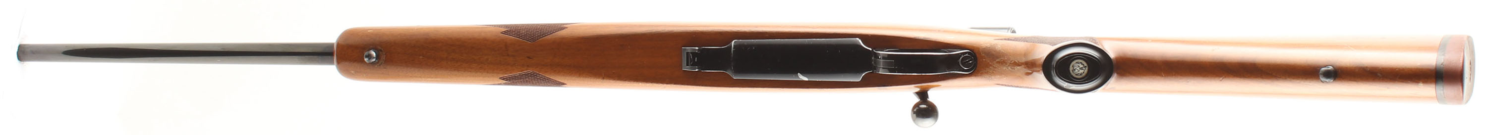 Ruger, Model M77, CAL: marked 7x57, MFG. 1975, SN: 71-63006, 22'' Round tapered barrel. The factory checkered & capped pistol grip wood stock is excellent, but with several minor to small scrapes, scratches, contusions & some flaking or thinning to the original finish. The original metal blue finish rates 90% on barrel & receiver, toned plum on receiver. Finish on the floorplate & trigger guard rates 80%. Small six digit # electro-penciled on left side of receiver next to SN. Bore is excellent. The receiver carries a period correct, unmarked scope on the integrated receiver rail, while the barrel has no open sight provisions. Stock carries a Ruger solid rubber recoil pad & sling studs. Solid & original. FFL or C&R Req. - Value: 600 to 900