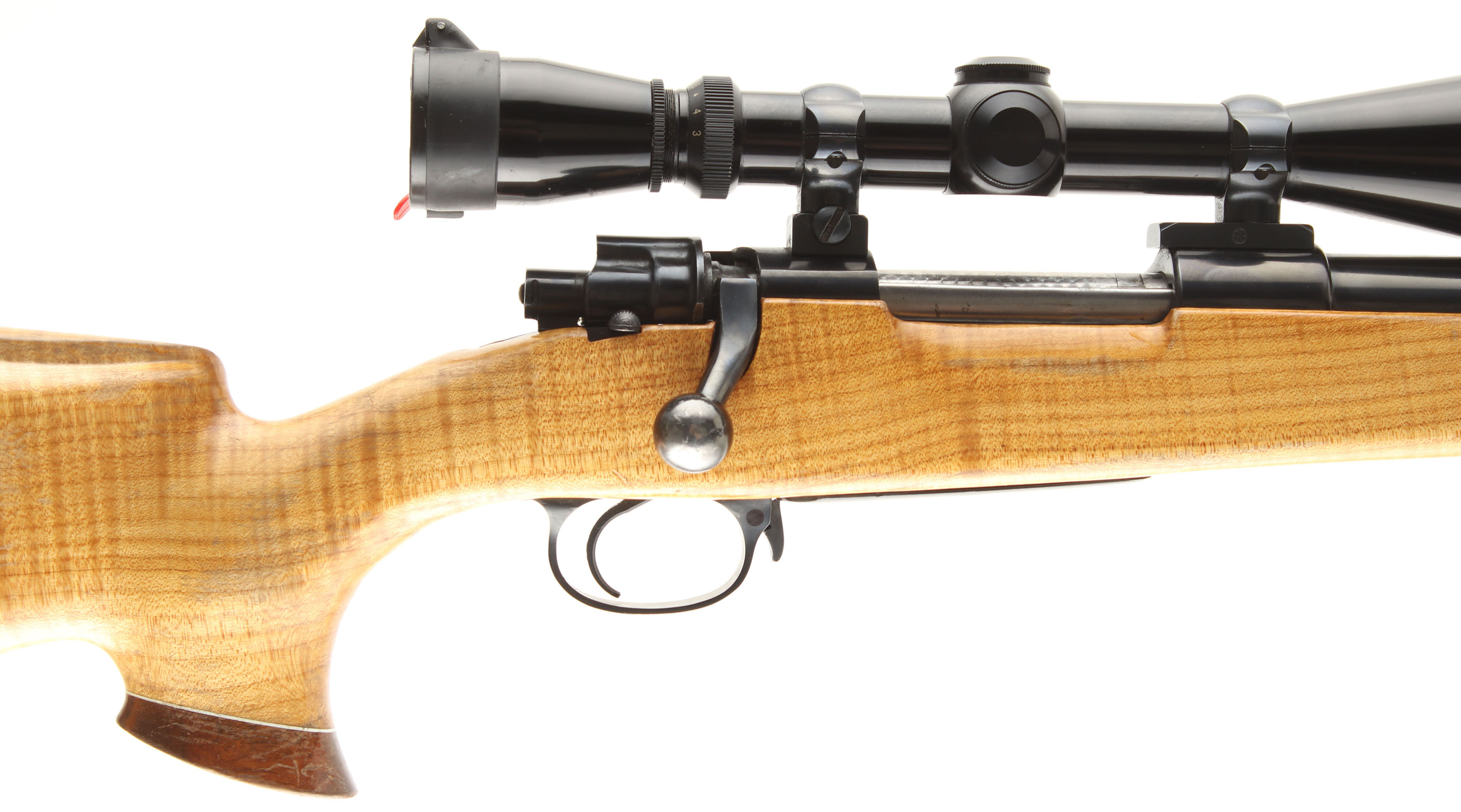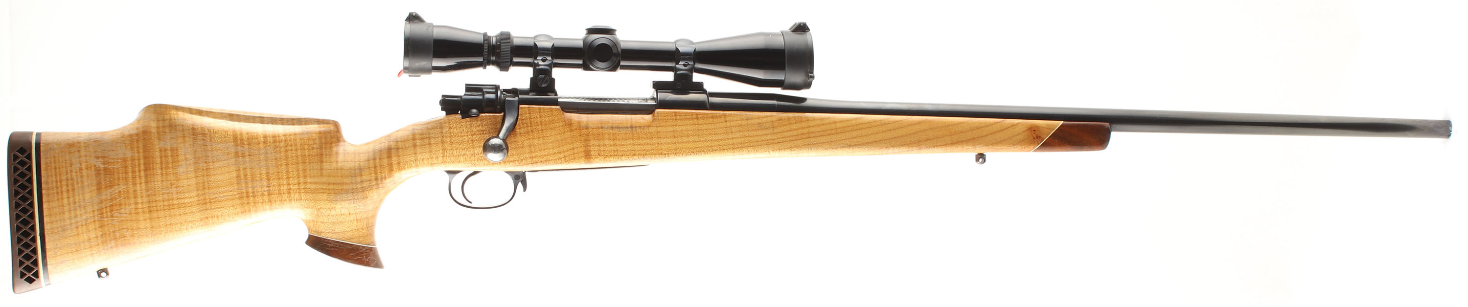 Custom Built Rifle, Built from a Commercial Mauser Action, CAL: 7MM REM MAG, MFG: 1940's-80's, SN: Z-55354, Bolt Action Rifle, 22 1/4'' Round barrel. This rifle was built in the mid 1980's by Carmichael Gun Shop in Carmichael CA. The action carries ''Z'' prefix SN denoting it is from the Santa Barbara Spain factory, known for the high quality actions intended for the commercial & custom built market. The custom curley maple stock carries a cheeked & capped pistol grip Monte Carlo style, with slanted rosewood forend tip & pistol grip cap. The stock is wood is excellent, but it does display lots of scratches, scrapes & finish thinning & wear, most of the wear exhibited on the back right side portion of the stock. The metal blue finish rates 90% overall. Some additional wear on the trigger guard & floorplate, which is stamped ''5465''. The receiver carries a Leupold 3-9 VARI-X IIc scope, with flip-up caps, on Redfield mounts, with no open sight provisions on the barrel. The consignor indicated that Carmichael's utilized a Douglas custom mid-weight barrel, but it carries no markings. Bore is excellent. Stock carries a Pachmayr White-line ventilated recoil pad. Sling studs. Jeweled bolt. Recently tuned-up at a licensed gunsmith. A very well built & customized hunting rifle. FFL Req. - Value: 800 to 1500