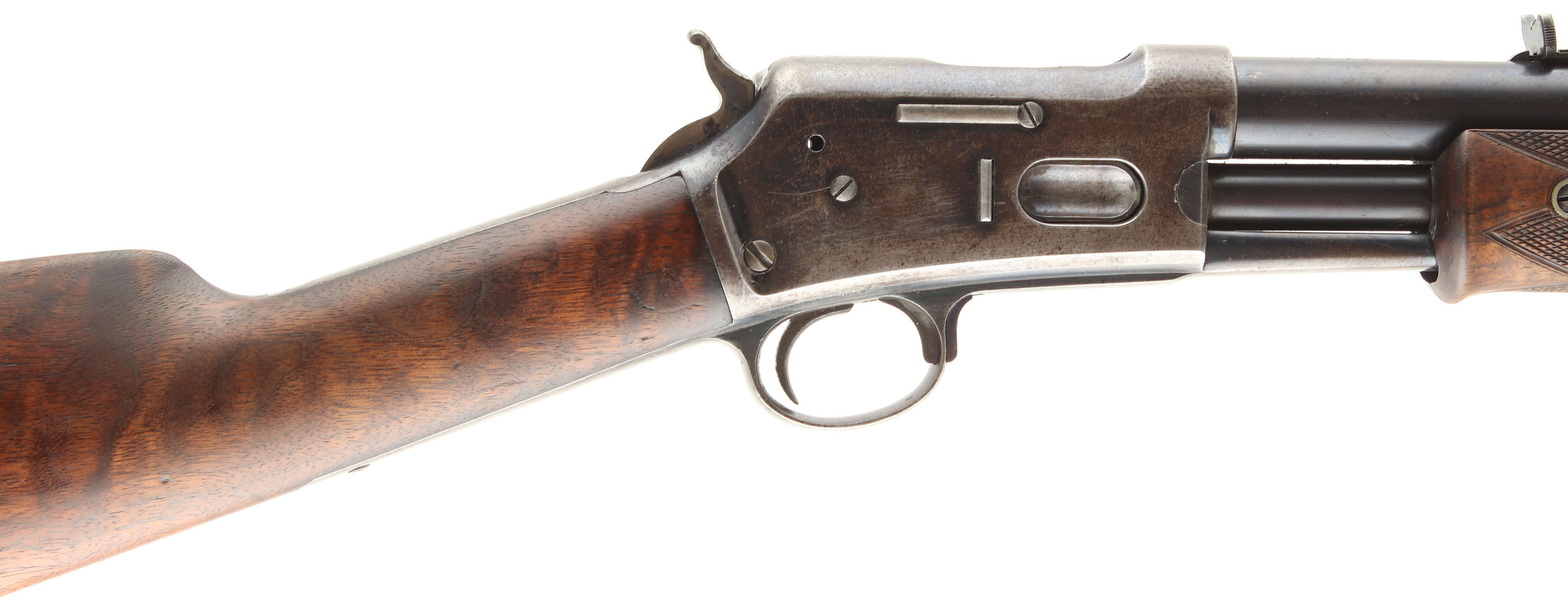 Colt Lightning, Medium Frame. Marked .44 CAL (44-40 WCF)., MFG. 1886, SN: 19956, Pump Action Rifle, 26'' Round barrel, Full mag. The factory straight grip stock & checkered forend are excellent, with minor to small scrapes, scuffs & contusions, to the evenly thinning original finish. The forearm checkering remains prominent, with some smoothing of the points & carries the original thinning finish. The original metal blue finish rates 60% on the barrel, 20% on the mag tube, with the receiver worn mostly gun metal gray & a thin brown patina, with remnants of original blue in protected areas. Bore is very good & bright, with some spotty areas of cleaned roughness. Barrel carries an adjustable rear & an elongated blade front sight. Crescent metal buttplate. Overall, very nice original & antique pump rifle. Antique, No FFL Req. - Value: 2500 to 4500