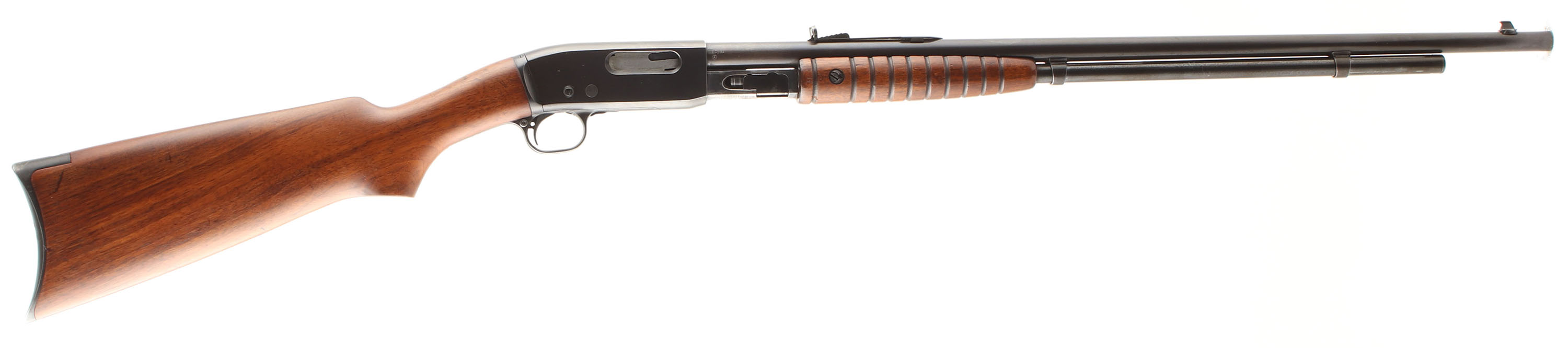 Remington, Model 25, marked 25-20, MFG: 1923-36 SN: 9545, Pump Action Take-down Rifle, 24'' round barrel. The original flat pistol grip wood stocks are excellent & solid, with the stock having been professionally cleaned, lightly sanded & nicely refinished to match the original finish still on the forend. There are minor finish level light scratches or handling marks to the stocks. The original factory metal blue finish has 90% coverage on receiver, 80% on the mag tube & barrel, with the barrel starting to tone plum in areas of thinning. Bore is excellent. Barrel carries an adjustable rear & standard front sights. Remington stamped crescent metal buttplate. These smaller caliber & light weight pumps were popular for small game & varmint hunting & most saw heavy use. With less than 32,000 model 25 rifles produced, nice examples are fairly rare. FFL or C&R Req. - Value: 500 to 1000