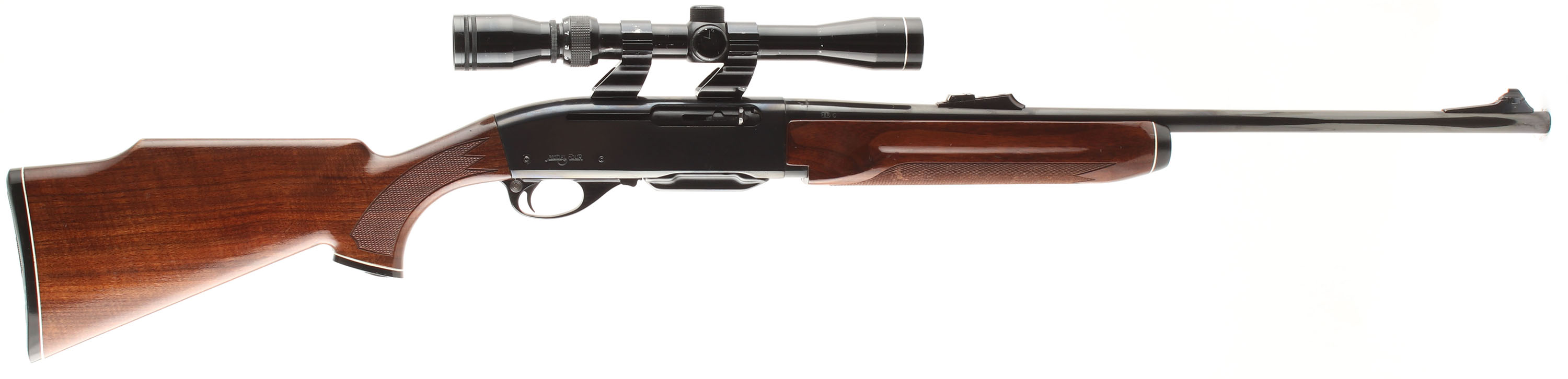Remington, Model Four, CAL: 30-06 SPRG, MFG: 1984-87, SN: A4110417, Semi Auto Rifle, 22 1/2'' barrel. The original checkered, cheeked & capped pistol grip Monte Carlo style walnut stocks are excellent, with very few minor handling marks or rubs to the excellent original finish. The original metal blue finish rates 95% overall. Bore is excellent. The receiver carries a Tasco W39x32 3-9X32 scope, while the barrel holds the factory rear sight base, no sight, & a ramped blade front sight. The stock carries the factory buttplate. Detachable mag. Overall excellent & original condition. FFL Req. - Value: 600 to 1000