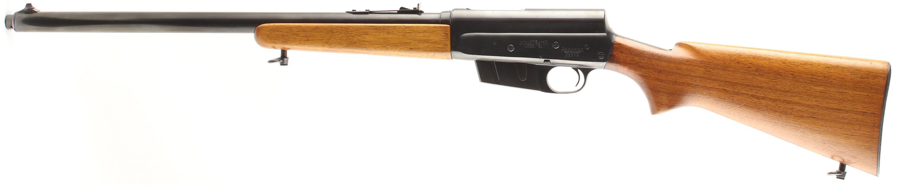 ODDITY Remington, Model 81, .22-250 REM. CAL., MFG. 1945, SN: 23373, Semi-Auto Rifle, 22'' barrel. This rifle is very unique as it has undergone a restoration & conversion. The rifle started life in 300 Savage caliber & is factory marked as such on the barrel bell. Over the span of 45 years of collecting these rifles as a family, we have encountered a handful of these rifles. The story as shared with us as to how these 22-250 rifles came to be is unique. Apparently there was a southern Oregon gunsmith who was known to convert Remington model 8 rifle into 22-250 & 300 Sav. calibers before Remington ever produced the 300 Sav. caliber in their Model 81 rifles. It was a Remington factory rep. during his business travels that stumbled onto one of these rifles & the gentleman who had converted it. He was so impressed with the 300 Sav. version that he asked to borrow the rifle to take it back to Remington's head quarters to be tested for possible factory production. Remington's R&D & their Brass, were also so impressed, that the 300 Sav. caliber soon became a regular offering within the Model 81 production. Although this is obviously not one of the those conversion 300 Sav. rifles, rather it was a factory 300 Sav. that was likely converted to the 22-250 caliber by this same gunsmith. The few that I have encountered or heard of, had their caliber marking changed from the original, which is not the case with this rifle, therefore retaining the original 300 Sav. factory stamping. According to the consignor, this rifle was tested & verified by his gunsmith as correctly fitting, firing & functioning as a 22-250. However, we have not verified or tested the rifle ourselves. Also the story of its possible origins & conversion is simple the sharing of information as shared with us. The original flat pistol grip wood stocks are excellent, having been cleaned & refinished, with some thinning in the carry areas. There are tiny to minor handling marks, scrapes & contusions remaining. The metal blue finish was professionally restored, with 95% coverage. There is some cleaned speckling & a bit of spotty orange peel under the blue in areas. The barrel carries the standard front & rear sights. Bore is excellent, clean & bright. Stock carries the original Remington checkered metal buttplate. 5 rd fixed magazine. Sling swivels in stock & forend. A very unique & overall excellent condition 81 rifle, which likely has collectible interest to 8 & 81 collectors or fans of the 22-250 caliber. FFL or C&R Req. - Value: 600 to 1200