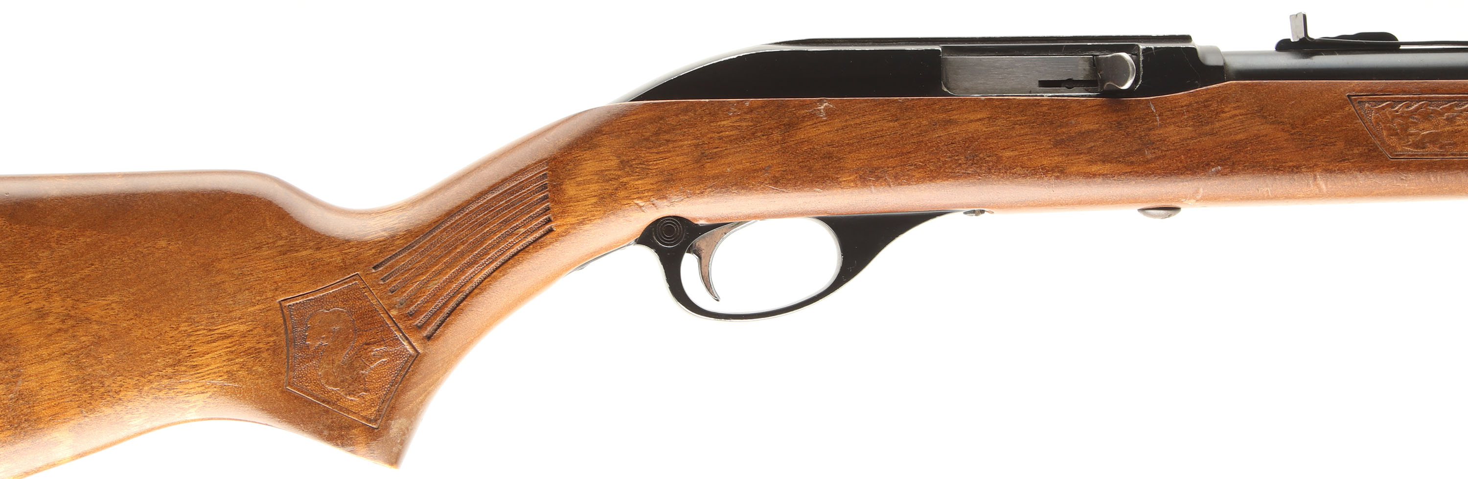 Marlin, Model Glenfield 60, CAL: 22LR, MFG: 1971, SN: 71430534, Semi Auto Rifle, 22'' barrel. The original flat pistol grip Monte Carlo stock is excellent, with a few minor handling marks to the original finish. The wood features pressed squirrel, oak leaves & stripe accents. The original metal blue finishes rates 85% overall. Bore is excellent & bright. The receiver previously had a scope mounted, while the barrel carries an adjustable rear & ramped blade front sights. Stock carries a checkered plastic buttplate. 14 rnd tube mag. Very nice overall. FFL or C&R Req. - Value: 150 to 300