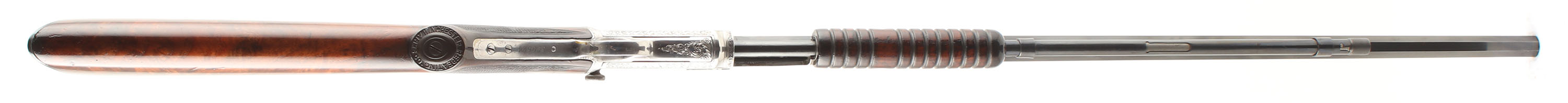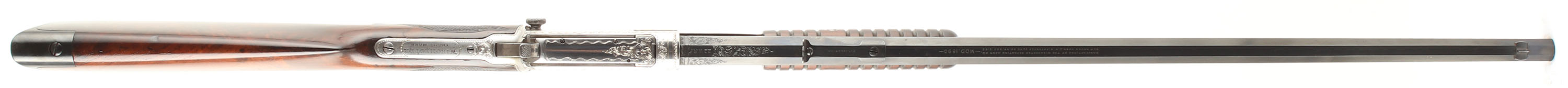 FANTASTIC NICKEL ENGRAVED Winchester, Model 1890 2nd model, .22 WRF Cal., MFG. 1907, SN: 329524, Pump Action Rifle, 24'' Tapered Octagon barrel, The receiver, barrel & trigger guard are elaborately scroll engraved, with forest scenes depicting two squirrels on the left side of the receiver & three rabbits on the right side. This engraving is as shown on pg. 125 of ''Winchester - An American Legend'' by R. L. Wilson as being Winchesters No. 8 style, ''Especially suitable for rifles having small frames, such as the Model 1890 & the Single Shot''. Band & small scroll engraving is displayed on all flats of the barrel, with additional 1'' scroll on four side flats & 2'' of scrolls on the top flat beyond the caliber marking. Neither the top of the receiver or the barrel are proof stamped as you would expect on a factory engraved rifle. The deluxe original capped pistol gripped walnut stock has Winchester' fancy ''H'' style hand checkering. The stock exhibits fantastic grain. There is a dowel sized repair (restoration), one on each side of the wrist, where a pin through the wrist once resided for known reason. Does not appear that it was necessary for stability, as the wrist is structurally sound. However, there is a small 1'' tight stress crack off the left side of the upper tang & running downward into the checkering on the wrist. The stock appears to carry an added layer of finish, likely added at the time of the wrist restoration. The corncob forearm & its finish appear original with use thinning of the finish & darkening at areas of finish loss. Overall, the socks present very well. The metal blue finish appears to have been restored, rating 90% on the barrel & mag tube, with some spotting, speckling or light pitting in areas. The nickel on the receiver rates excellent, with some thinning on the sides & inside the trigger guard. Bore is excellent. Factory front & rear sights. The left side of the lower tang under the wood is stamp ''3925X'', the ''X'' marking it as a deluxe wood rifle. The ''3925'' is also stamped on the buttend of the wood stock & on the inside of the buttplate. These numbers are the first four digits of the SN, but oddly stamped ''3925'' rather than the ''3295'' of the actual SN. There is some question to whether this rifle was factory engraved or the professional Custom engraving of a factory deluxe rifle. It is honestly very difficult to determine from simple examination. The engravings & stampings are sharp as you'd expect from the factory. If it is custom engraving outside the factory, the current blue would have been done after the engraving. Without the proof a factory standard or deluxe rifle, one would infer that the receiver was pulled from standard production before proof stamping for factory custom shop engraving. Regardless, it is truly a wonderful nickeled engraved 1890 rifle, that presents very sharply & is in excellent condition. FFL or C&R Req. - Value: 5000 to 8000