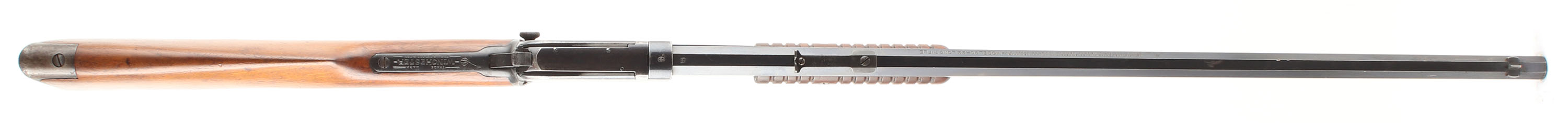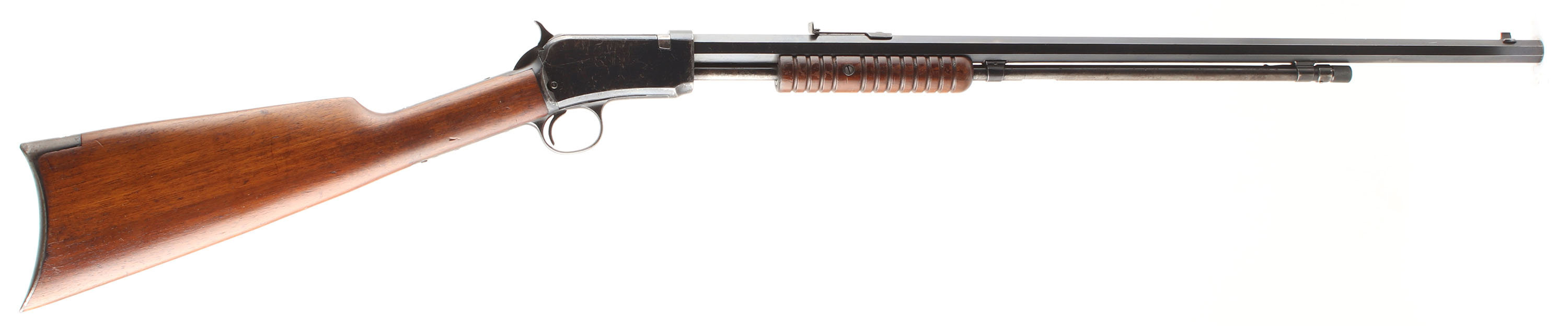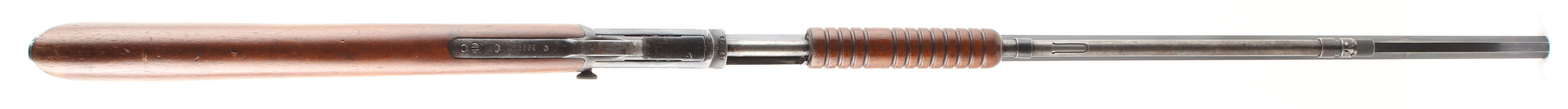 Winchester, Model 90, .22 LONG RIFLE Cal., MFG: 1923 SN: 689947, Slide Action Pump, 24'' Tapered octagon barrel. The L.R, only caliber is the rarest & most desired caliber amongst collectors as only 10% of total production was this caliber. The L.R. caliber was added in the mod 90 line-up in 1919. The original wood stocks are excellent, with several minor handling marks, scratches & light contusions to the original finish. The original metal blued finish rates 90% on the barrel, 60% on the receiver, & 30% on the mag tube, with loss on the receiver due to scratches & wear. Bore is excellent. Barrel carries the original front & rear sights. Factory crescent steel buttplate. Excellent original example of a single caliber 90 remaining in very high collectible condition. FFL or C&R Req. - Value: 1000 to 2000