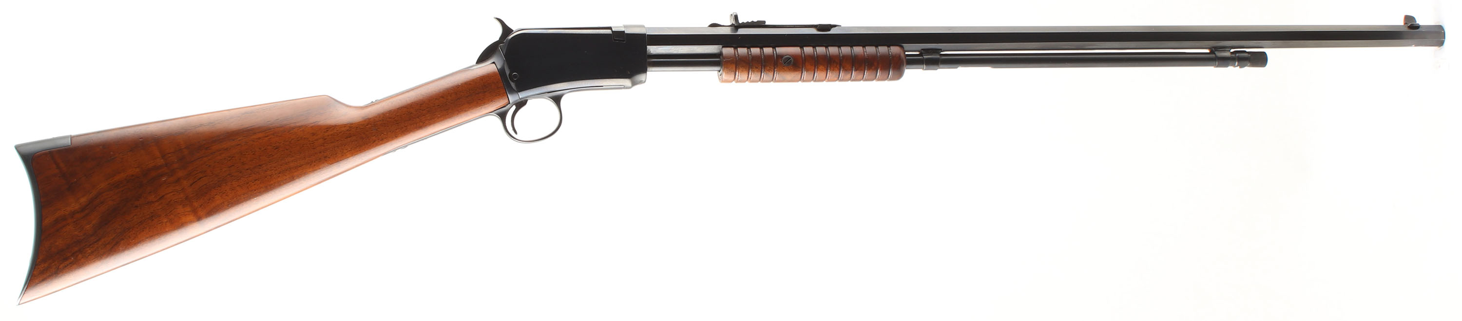 Winchester, Model 90, .22 LONG R. Cal., MFG: 1919 SN: 626385, Slide Action Pump, 24'' Tapered octagon barrel. This Rifle has been fully restored. The L.R, only caliber is the rarest & most desired caliber amongst collectors as only 10% of total production was this caliber. The L.R. caliber was added in the mod 90 line-up in 1919 making this a 1st year rifle with this caliber. The original wood stocks are excellent, as lightly sanded & expertly refinished. There are very few tiny handling marks to the excellent finish. The restored metal blue finish rates 95% overall. Bore is fair, with cleaned roughness & a ring in the thin rifling mid barrel, no bulge. Barrel carries an adjustable rear & blade front sights. Factory crescent steel buttplate. A sharp example of a restored single caliber mod 90. FFL or C&R Req. - Value: 800 to 1200