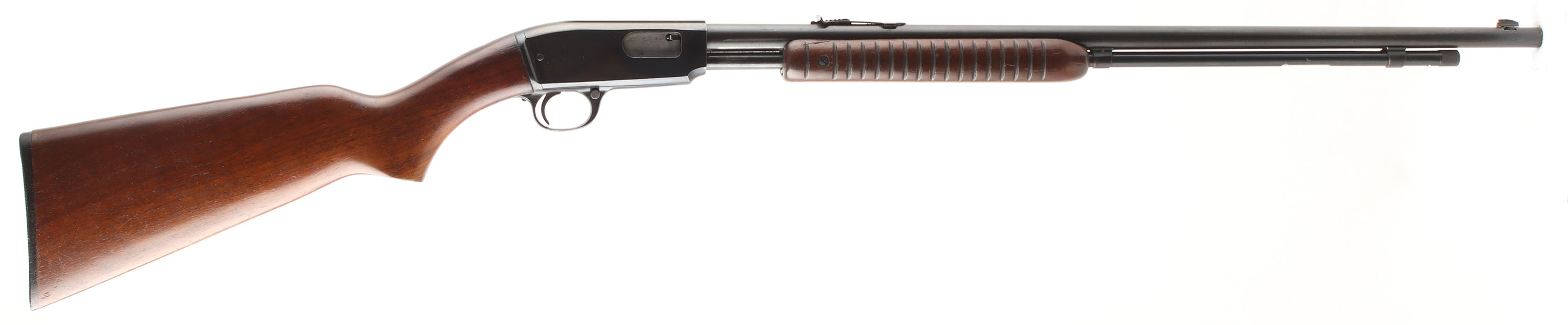 Winchester, Model 61, Marked .22 WIN. MAG. R.F., MFG. 1960, SN: 301054, Pump Action Rifle, 24'' round barrel, Grooved receiver. Desirable single caliber marking, with .22 Win Mag being the most desirable in the round barrels. The original flat pistol grip wood stocks are excellent, with a few minor scrapes, scratches & contusions to the original finish. The metal blue finish rates 90% overall. Toning a bit gray on the barrel as it thins & some speckling on the receiver. Bore is excellent & bright. The barrel carries an adjustable rear & elongated blade front sights. Factory checkered plastic buttplate. A very nice original example & collectible Win Mag caliber. FFL or C&R Req - Value: 800 to 1200