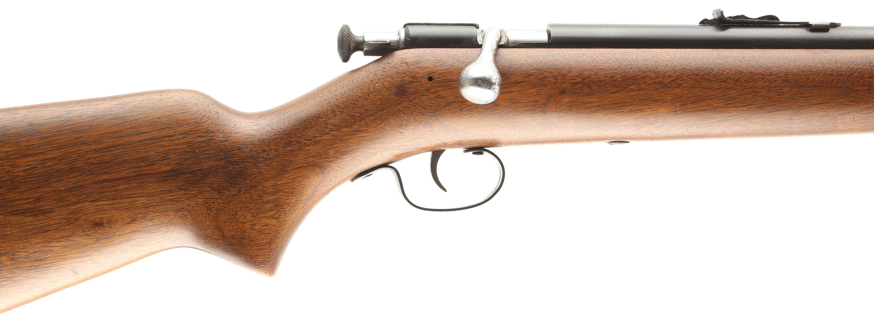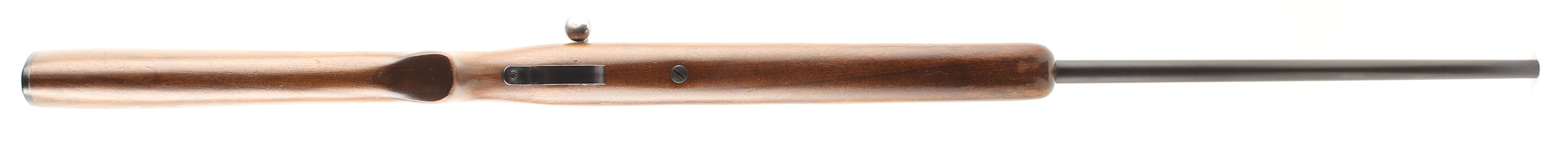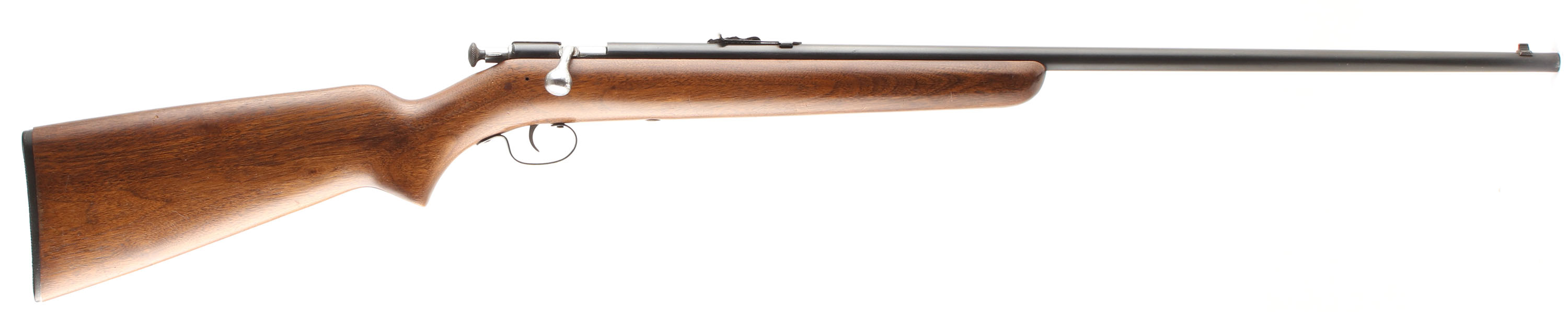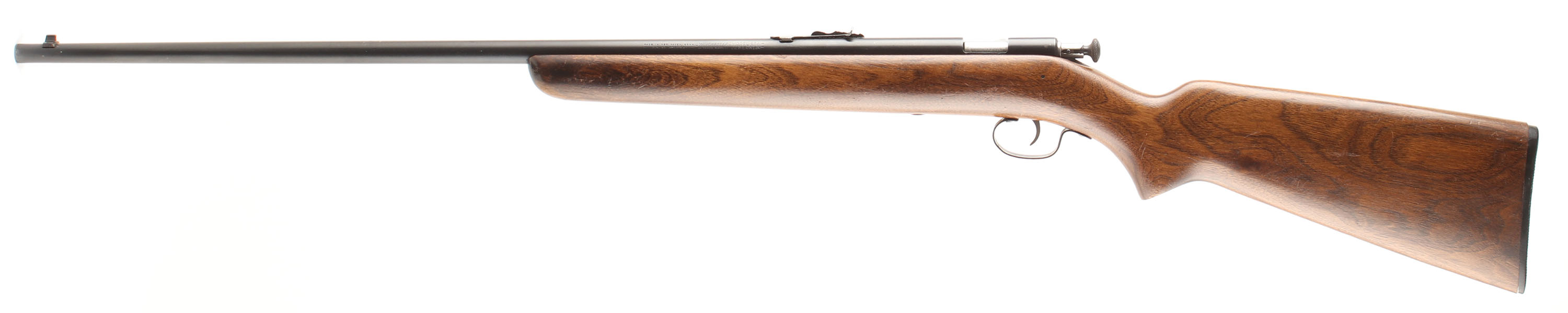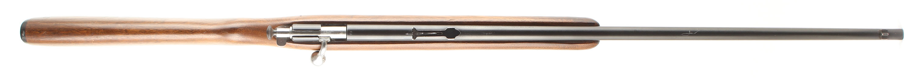 Winchester, Model 67A Sporting Variation, CAL: 22 S.L.LR, MFG: 1934-63, SN: N/A, Take-down Bolt Action Rifle, 27 1/8'' Sporting tapered barrel. This is a 3rd issue rifle, with the factory heavier forend (no finger groove), flat pistol grip stock, with the later tapered/slant forend tip. The original flat pistol grip wood stock is excellent, with some minor to small handling marks, scratches & contusions to the original finish. The original metal blue finish rates 90% overall. The barrel holds an adjustable rear & blade front sight. Bore is excellent. Buttstock carries a Winchester checkered black plastic buttplate. Excellent overall & original. FFL or C&R Req. - Value: 400 to 600