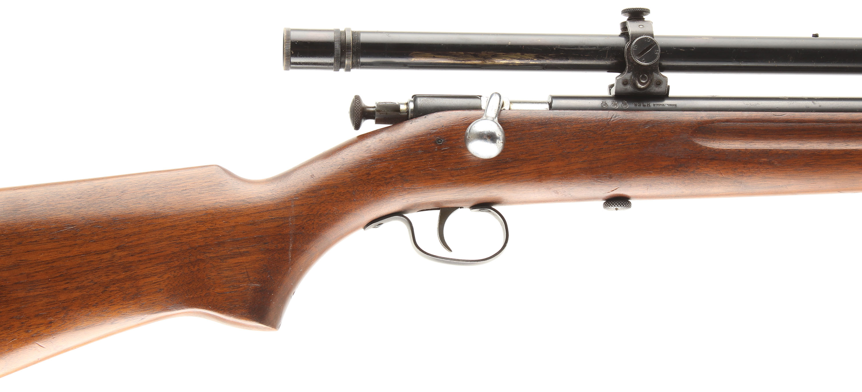 VERY RARE Winchester, Model 677 (Scoped Rifle), .22 S. L. LR. Cal., MFG. 1937-39, SN: None, Bolt Action Rifle, 27'' Tapered barrel. Although the barrel is marked ''67'' it is a rare model 677 rifle, with no factory provisions for open sights. Winchester sold the British Government scoped Models 67, 677, 69 & 697 rifles, to be used as military training rifles. The Model 677 & 697 rifles were in .22 S.L.or LR. Or WRF Cal., with scopes & no provisions for open sights. The Model 67 & 69 stamped rifles were in .22 S.L.LR. Cal. & fitted with the same scopes, but also with open sights. This is one of the rare Model 677 British Government rifles, without open sight provisions & British proofs. Next to the British proofs is the ''NOTBRITISHMAKE'' stamping. It also exhibits the ''N'' stamping on the barrel & Broad Arrow marking on the top of barrel & on the right side of the stock. The original pistol grip & early rare finger grooved forend wood stock is excellent & solid. It displays the majority of the original finish, with minor to small scratches, scuffs & contusions. The metal blue finish on the barrel & receiver is retained at 95% coverage. Finish on trigger guard rates 85% with edge wear toning to a brown patina. Bore is excellent & bright. Rifle is factory fitted with a Winchester scope on Winchester scope rings & blocks. The scope does have minor finish scratches on the tube. Again, the barrel has no sight provisions, which is factory for this model 677. Nickel bolt handle & trigger. The ''Winchester'' marked buttplate is also excellent. Only 2,240 produced. A very rare rifle with collectible optics. Highly sought after & collectible! FFL or C&R Req. - Value: 2000 to 4500