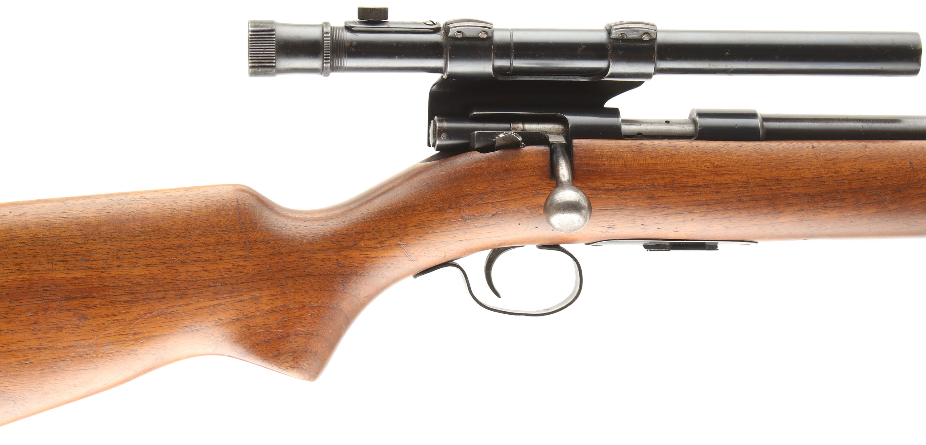 Winchester, Model 69A, CAL: 22 S,L,LR, MFG: 1935-63, SN: NONE, Bolt Action Rifle, 25'' barrel. The flat pistol grip wood stock, with slanted forend tip, is excellent. The original finish is wearing thin & with several minor to small handling marks, scratches & contusions. The metal blue finish rates 80% overall. Bore is excellent. The rifle is fitted with a Weaver Model 330 scope, while the barrel has a replaced blade front sight. Buttstock carries a Winchester marked, checkered black plastic buttplate. Blued bolt handle, trigger & trigger guard. Comes with a ''W'' stamped detachable magazine. FFL or C&R Req. - Value: 250 to 500