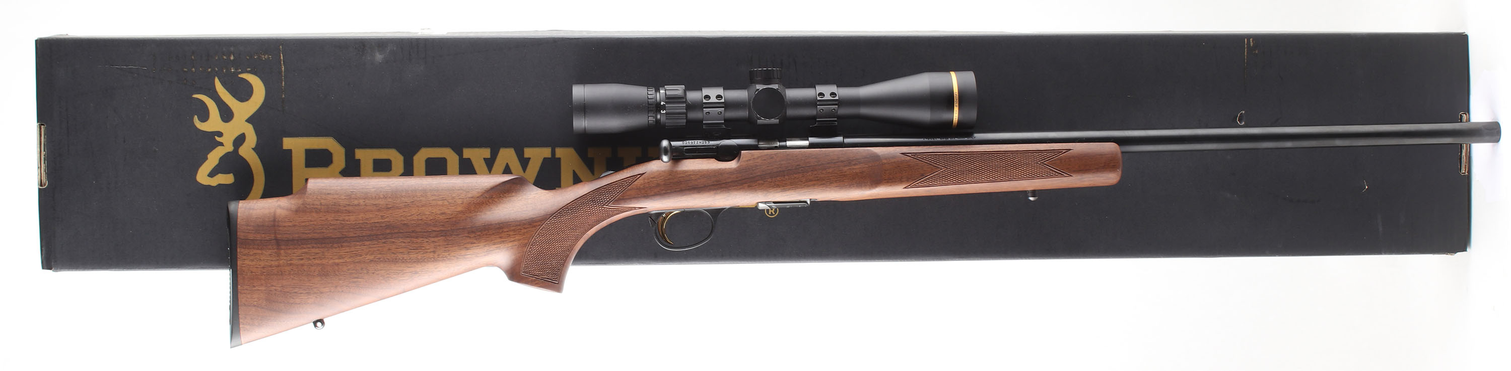 BOXED & NEW Browning, Model T-Bolt, CAL: .17 HMR, MFG: Modern, SN: 02697ZN253, Bolt Action Rifle, 22'' round barrel. The factory checkered & flat pistol grip walnut stock is near mint. The factory metal blue finish is 100%. Mounted with a Leupold VX-Freedom 3-9X40 scope & no open sight provisions. Mint bore. Browning plastic buttplate. Gold Trigger. Sling studs. Comes in the SN matching original box, with lock & paperwork packet. Basically NOS, with added quality scope. FFL Req. - Value: 800 to 1200