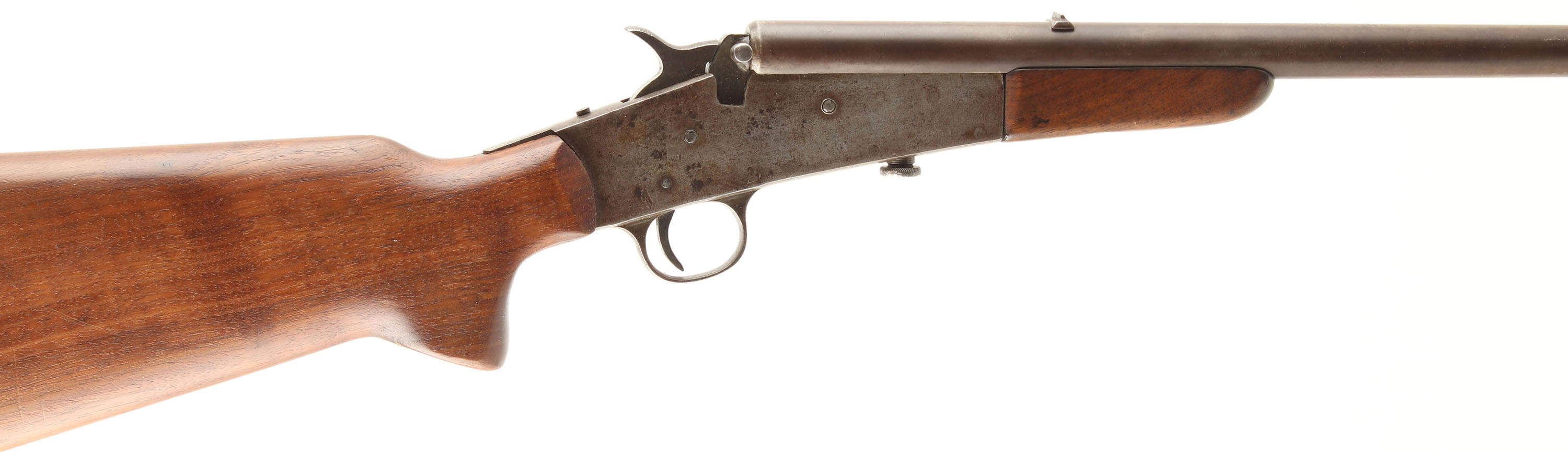 Remington, Model 6, Cal: .32 RF (Short or Long), MFG: 1901-33, S/N: 227067, Single Shot Rolling Block Rifle, 20'' barrel. The replaced wood stock & original forend are excellent, with light wear & excellent finish. The metal blue finish on the receiver has toned a gray/brown on the left, while it has worn mostly gun metal gray on the right, with a very thin brown patina. The barrel has worn gun metal gray, with a very thin brown patina. The bore is good, with some cleaned roughness amongst solid rifling. The barrel holds front & rear iron sights set in dovetail cuts. The stock carries a replaced FN black plastic buttplate. FFL or C&R Req. - Value: 150 to 300