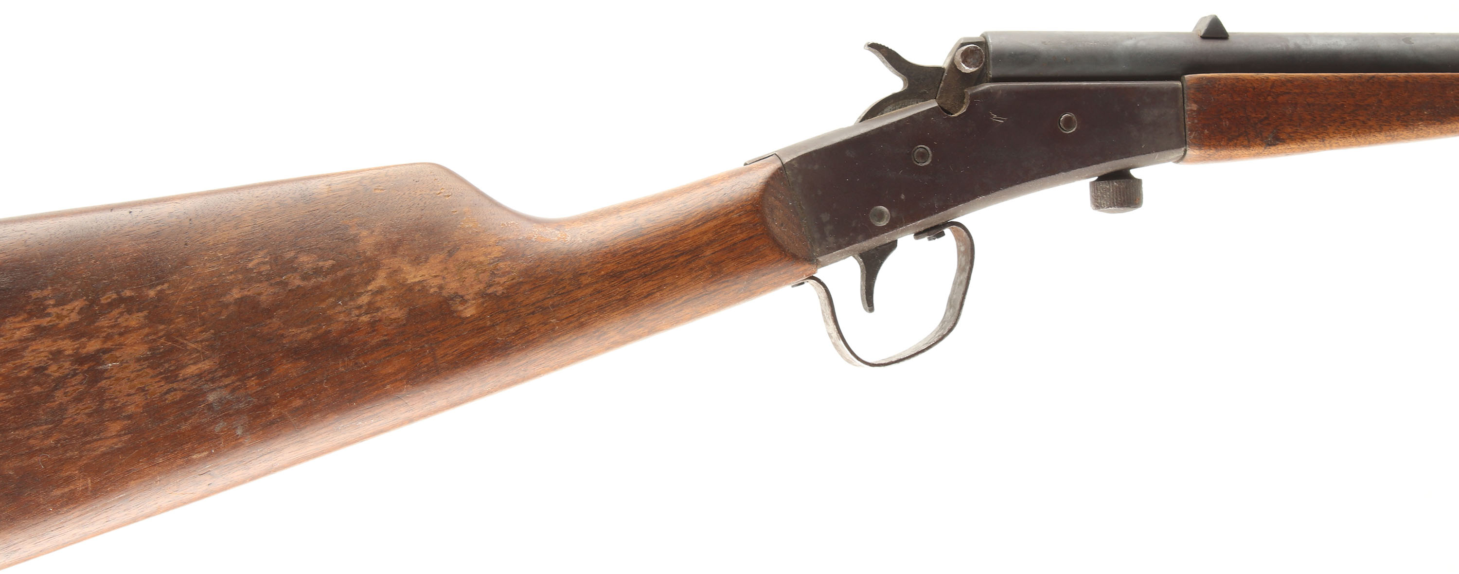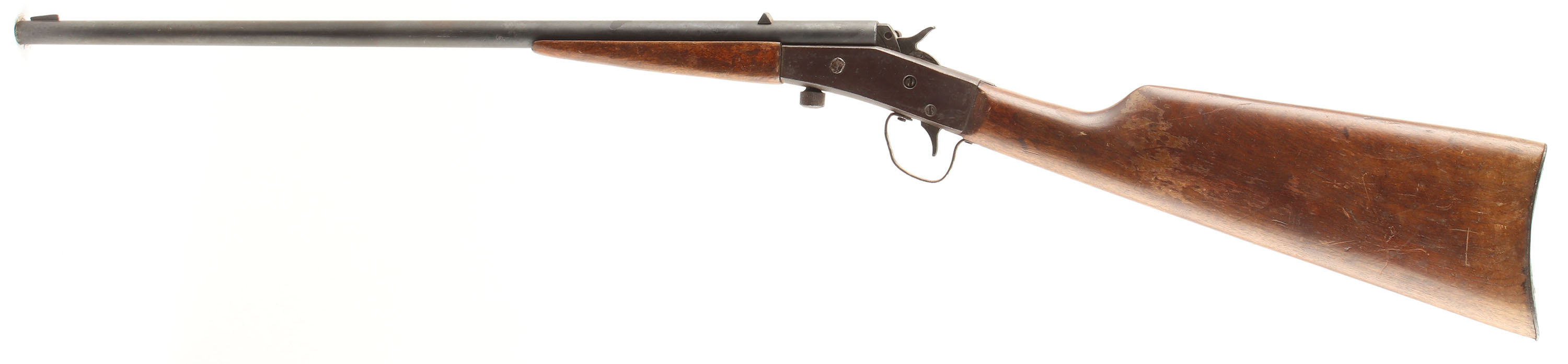 J. Stevens Arms Co. Model ''Little Scout No.14 1/2'', 22 LONG RIFLE, MFG: 1906-10, SN: N/A, Falling Block, Single Shot Rifle, 20'' round barrel. The original wood stocks are very good & solid, with several minor contusions, scrapes & flaking to the original finish. The metal finish on the barrel & receiver is an applied finish, with the barrel having a spotty gray/black coloring, while the receiver is mostly chocolate brown. Bore is good & bright, with thinned rifling. The gun is fitted with fixed rear sight & blade front sight. Metal buttplate. FFL or C&R Req. - Value: 50 to 150